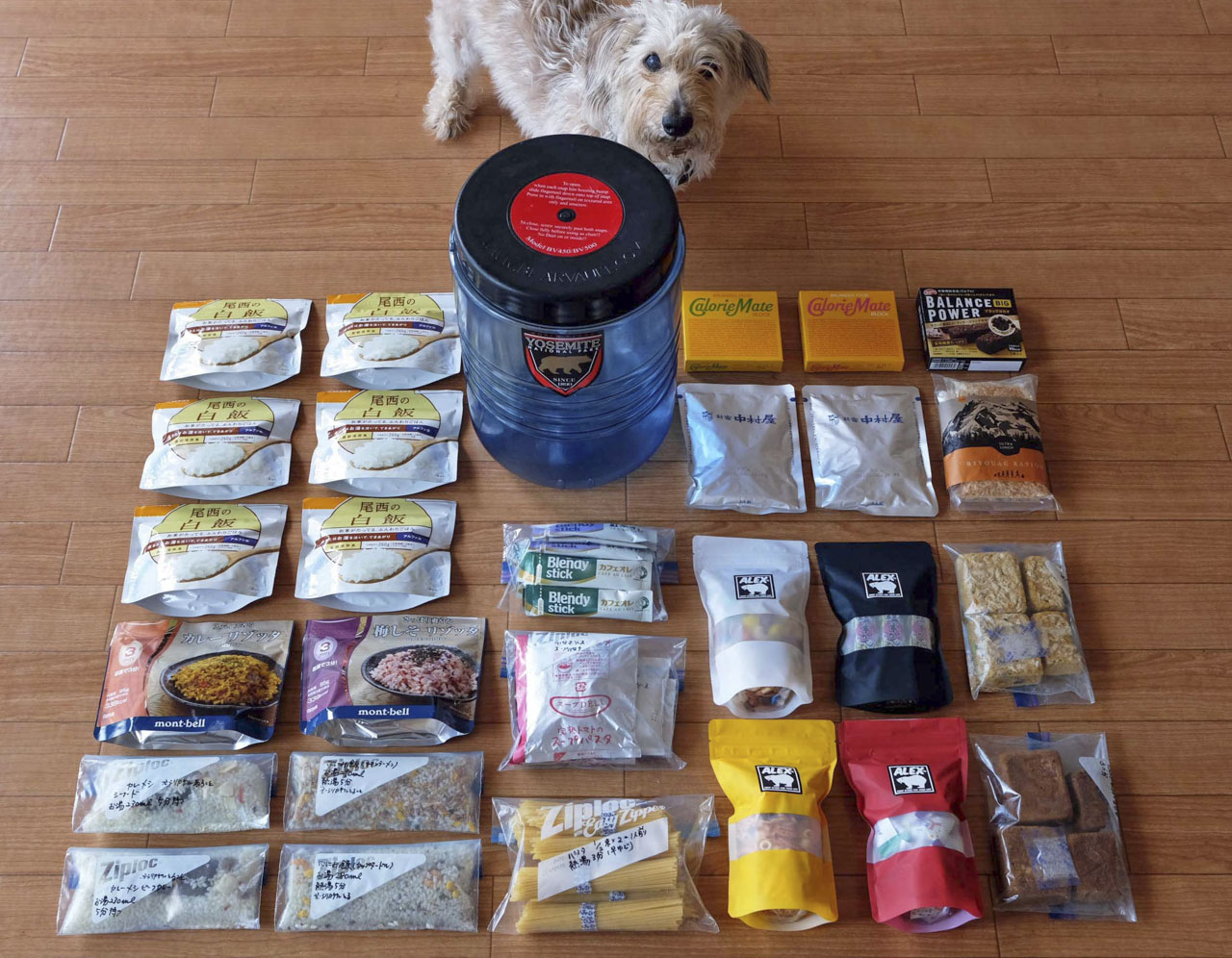 食料は「アルファー米+レトルト」「パスタ(短時間で茹でることのできる)+粉末状の具) 「日清のぶっかけメシ(ちなみにカレーメシは匂いが強烈な為、オススメしない)」「フリーズドライのシチューや親子丼+アルファー米」「ビバークレーション」など比較的コンパクトになるものがメイン。自分たちの場合、ベアキャニスターに収めることを第一に考えていたので、美味しいのは当然だけど「どうやって効率的に入れるか」に注力していた為、必然的に日本の食料がメインになってしまった。