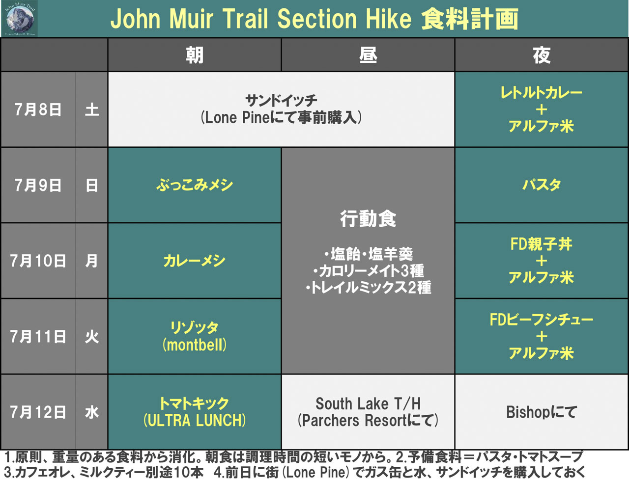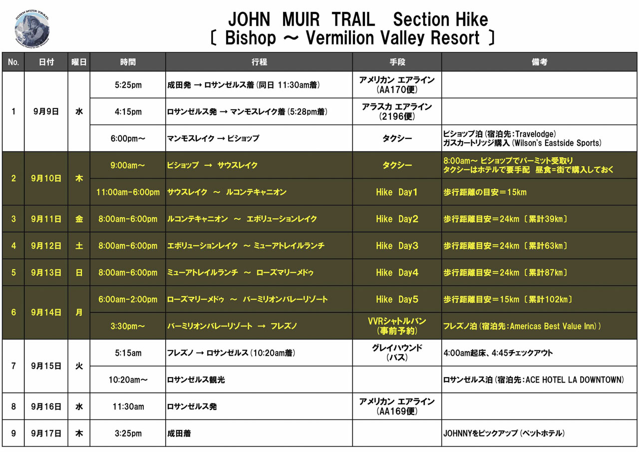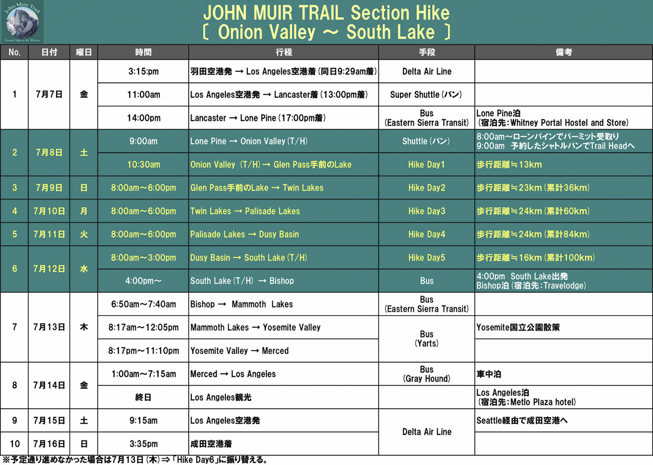 このスケジュールだと実際にトレイルを歩ける日数は5日程度 (JMTに合流するサイドトレイルの行程も含む)で、どちらのケースも到着したら翌日からトレイルインしているし、ハイク後の観光を特別多くとっているわけではないので、 これが5日間歩く際の最低限の必要日数だと思っている。