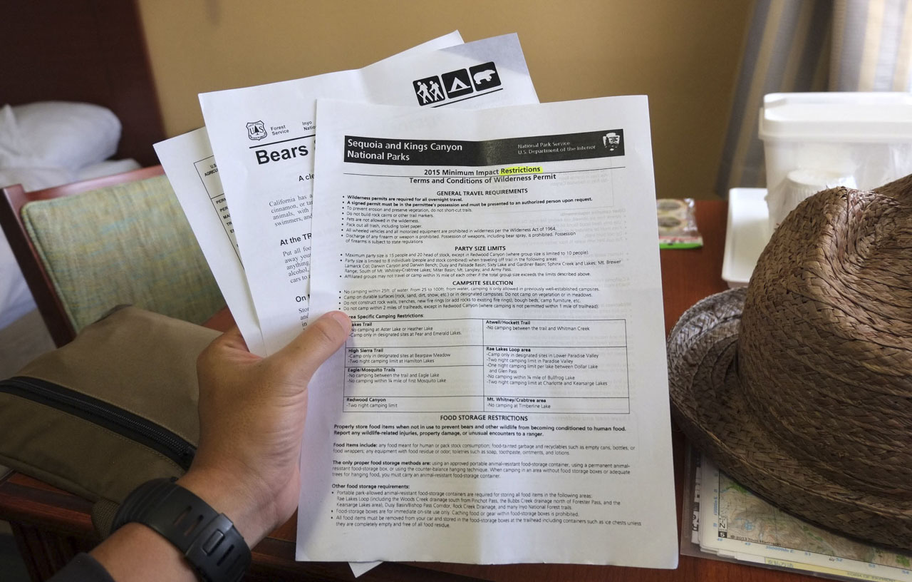 受付で予約した際の書類を提示して「パーミット、プリーズ」で十分通じる。自分はいつも「インヨー森林局」管轄の山域からトレイルインしていて、マンモスレイク、ビショップ、ローンパインなどの町にあるインフォメーションセンターで受け取っている(受け取り場所はネット予約時に指定できる)。 パーミットを受け取る際は以下の諸注意の説明を受け、同意してサイン。