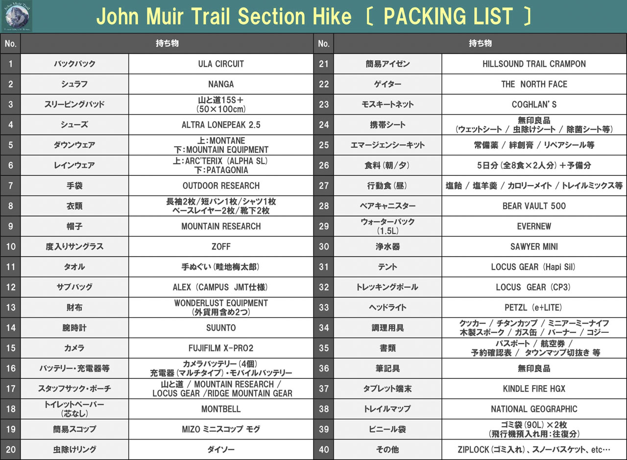 上は2017年のパッキングリスト。 歩くたびにコッチの方がイイな、コレはダメだなと発見がある。4回歩いてもそのアップデートはいまだに続いているので、正直、正解は分からない。