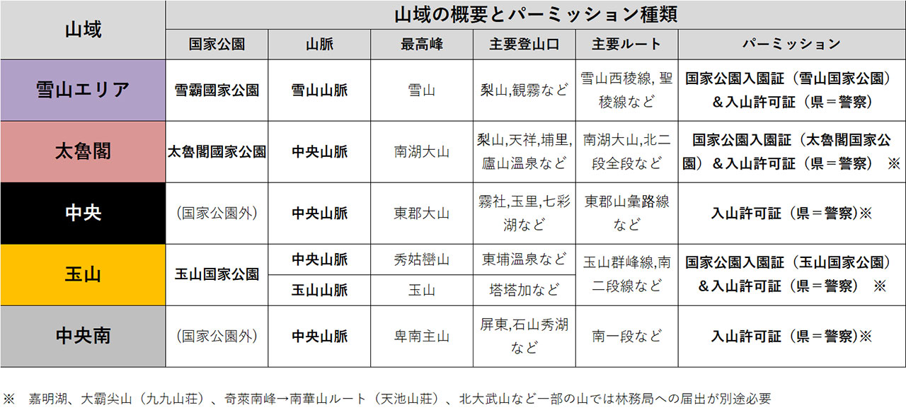 パーミッションは国家公園ごとの申請となりますので、まずは「玉山」「雪覇」「太魯閣」の高山が集まる3大国家公園を区分し、他の山域についてはエリアの共通性で分類しました。その結果は以下通りの5エリアです。