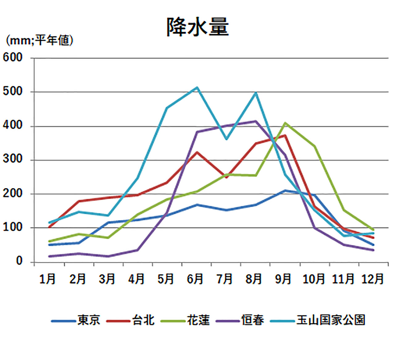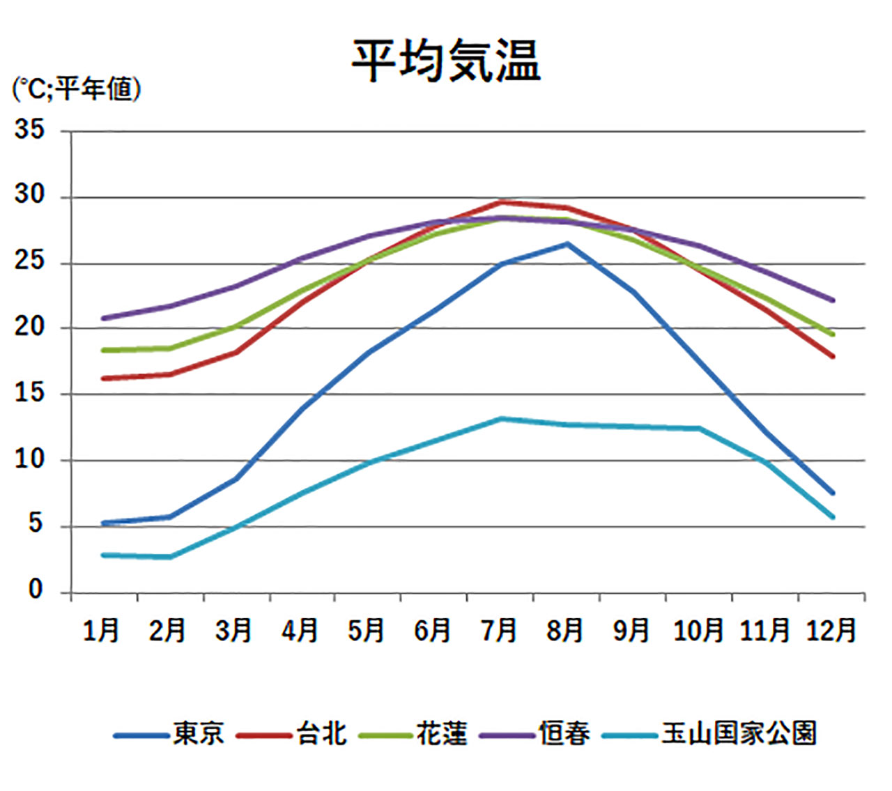 前述の通り、台湾島は台北などの北部エリアが亜熱帯、高雄、台南といった南部エリアは熱帯に属します。東京との比較は以下の通りです(ちなみに花蓮は東部、恒春は最南端の都市です。山岳地域の代表として、玉山国家公園の気候も加えました)。