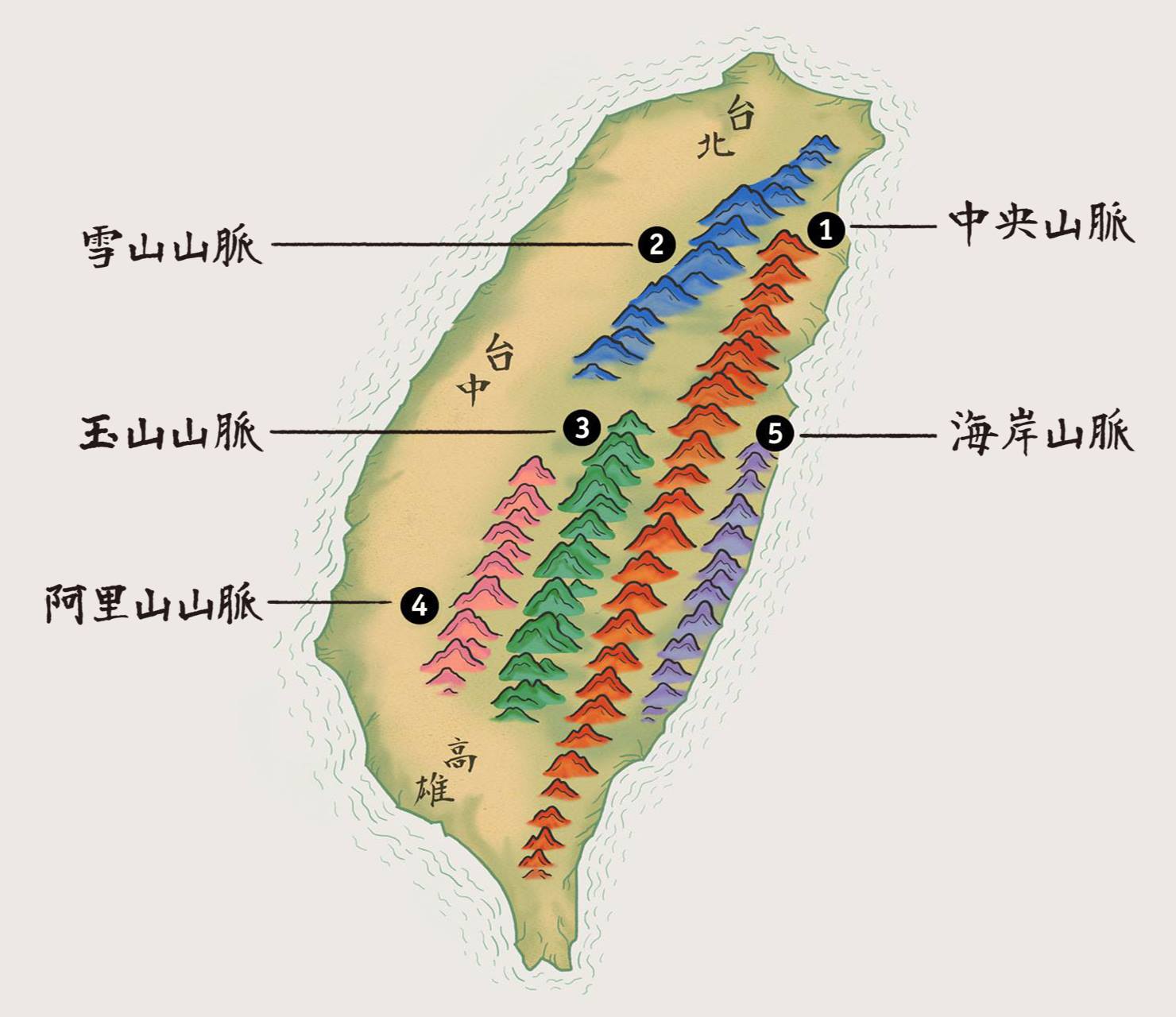 台湾には大きく5つの山脈があります。台湾島を背骨のように南北に貫く全長340kmの①中央山脈をはじめとして、中央山脈の北西に位置するのが②雪山山脈、その南に台湾最高峰の玉山を擁する③玉山山脈と④阿里山山脈、そして東岸に⑤海岸山脈があります。