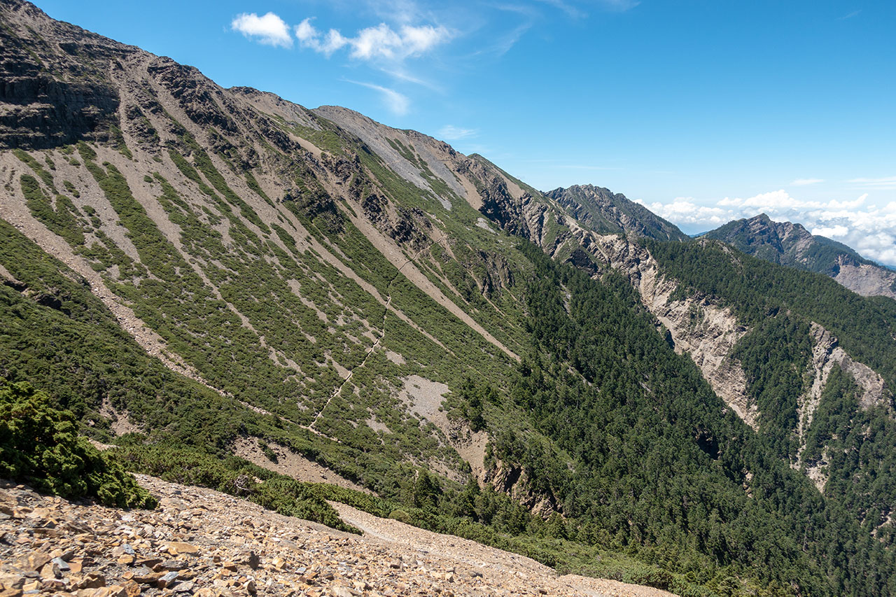 主峰直下には北アルプスの涸沢のようなカールが広がっており、主峰から西には翠池という台湾最高所の高山湖(標高3520m)もあり、「これぞ台湾の山岳地帯!」といった素晴らしい景観を誇ります。