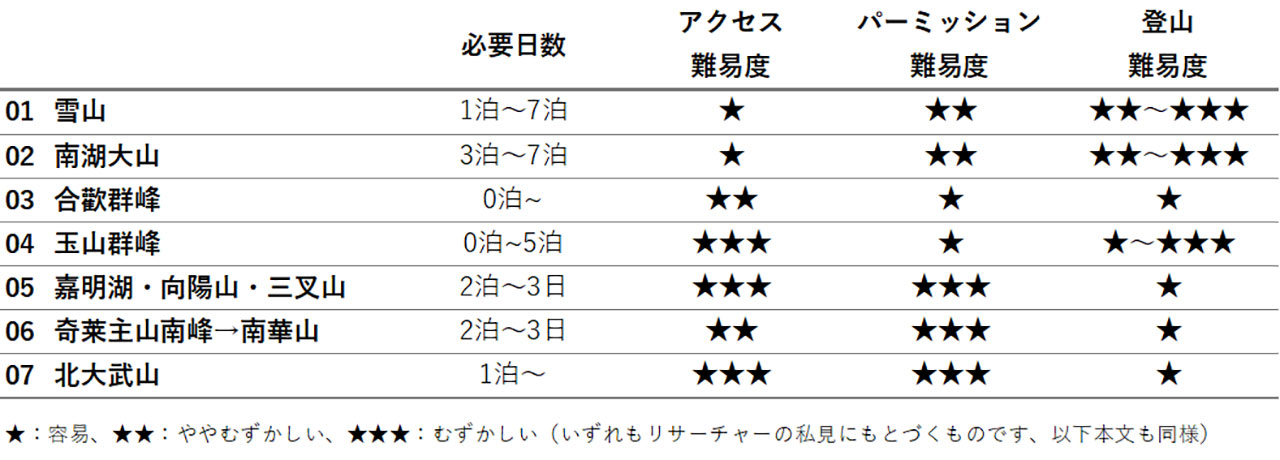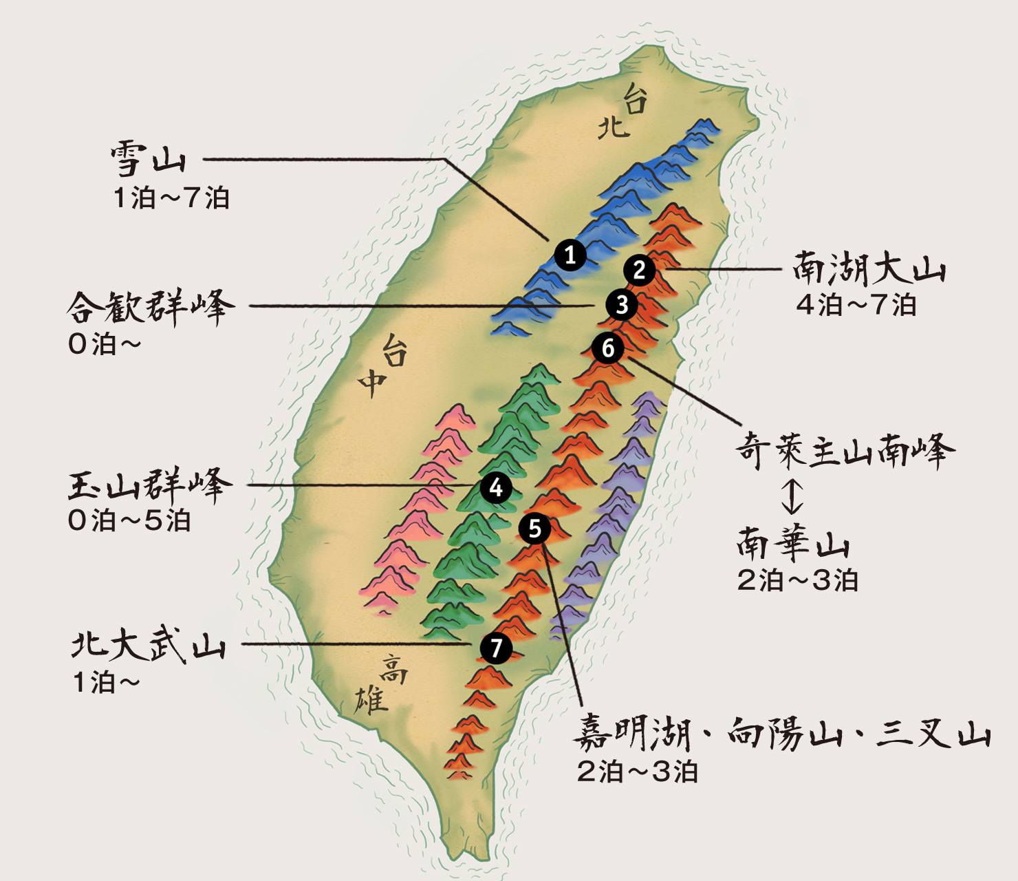 ※なお、向陽山・三叉山は玉山山脈ではなく中央山脈に属します。これらの山は例外的に林務局の管轄エリアとなっていますが、隣接する山々を含む一帯の管轄は玉山国家公園となっていますので、本稿では玉山エリアに分類しています。