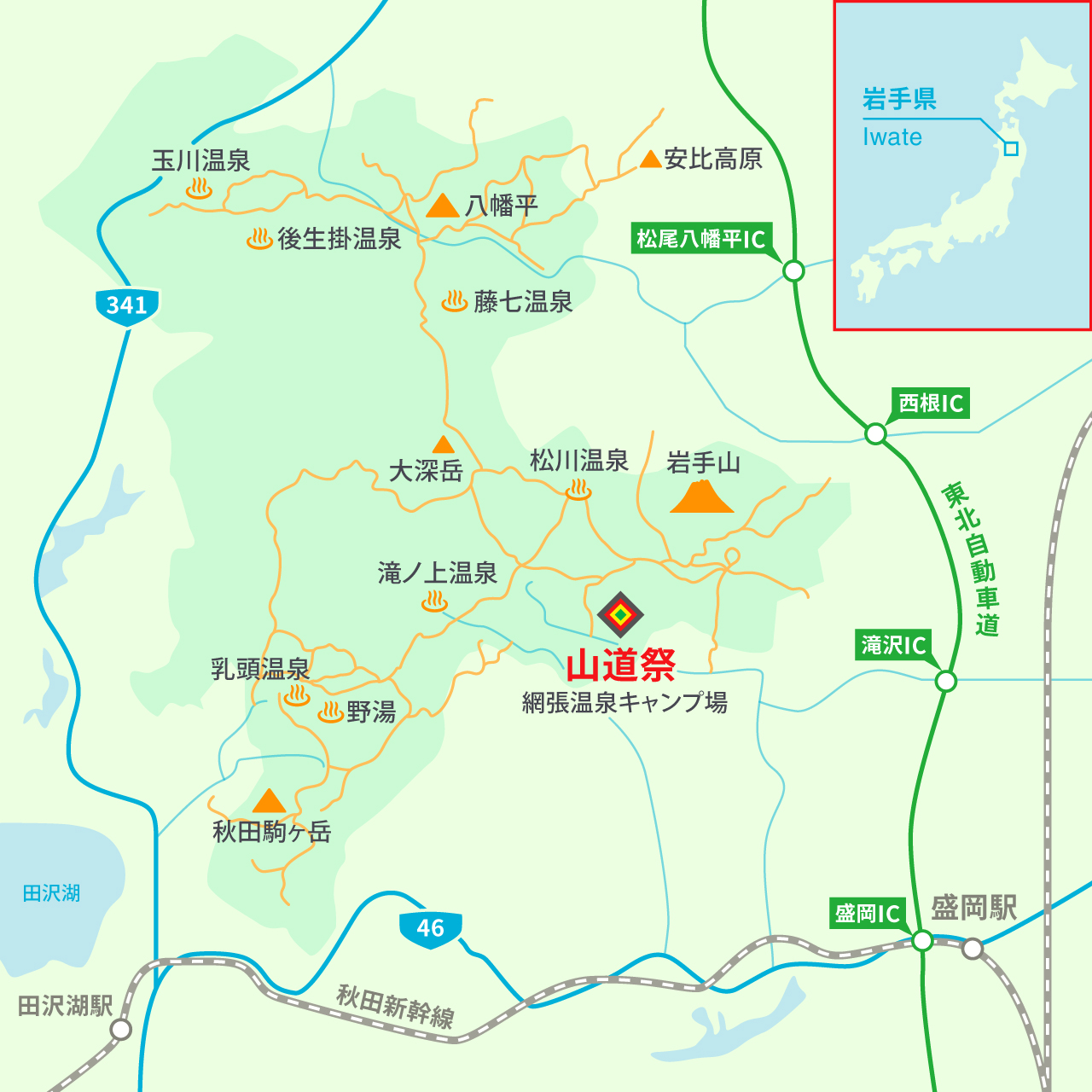 ハイカーたちが集う、ハイキングの祭り『山道祭』を岩手山の麓、網張温泉キャンプ場で開催します。八幡平、安比高原から温泉をめぐりながら歩いて来るのもよし、岩手山を登ってから来るのもし、ゴールの祭りを目指して歩いて行こう山道祭!