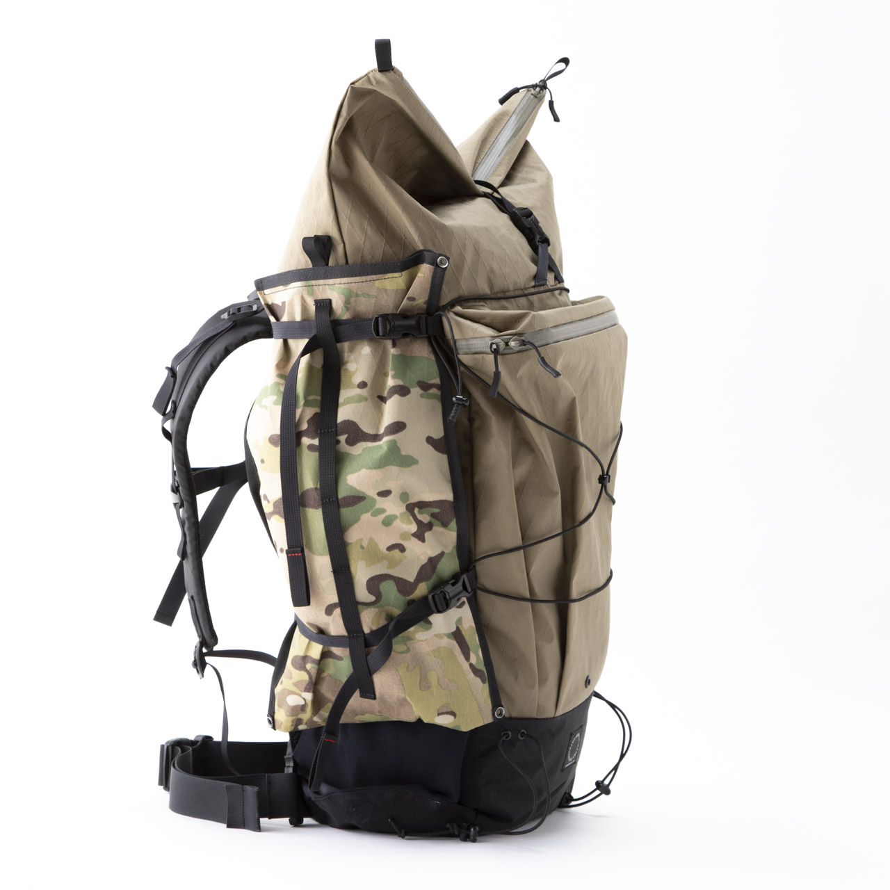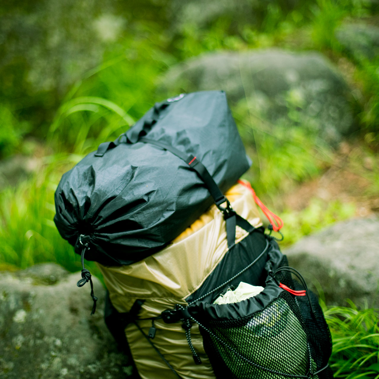 テントやグラウンドシートなど濡れるものや、食料や調理キットなどをまとめてバックパックに外付けできます。