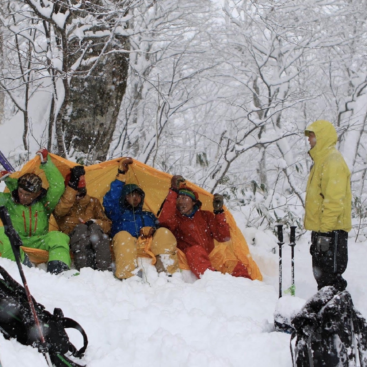 スノーシューやワカン、軽アイゼンを使用して雪道を歩いたり、これからの雪山で活躍するツエルトなどのシェルターを効率よく使用する練習も行います。