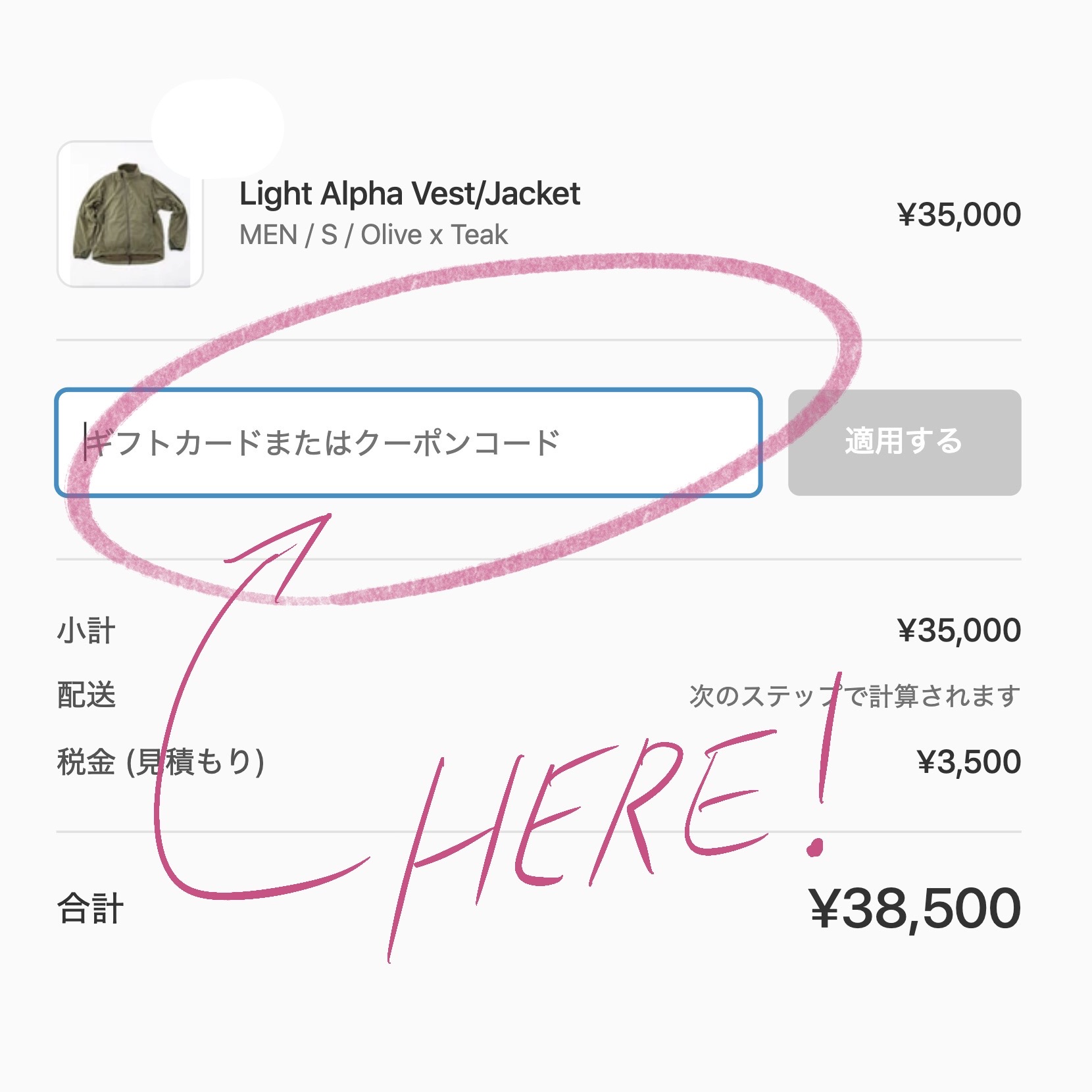 レジ画面で連絡先情報、配送先住所を入力し、画面右上の「ギフトカードまたはクーポンコード」ボックスにクーポンコードを入力し「適用する」ボタンを押すと30%オフの価格が反映されます。