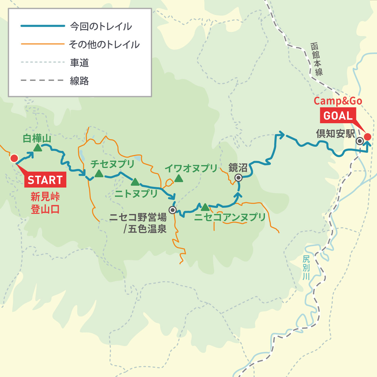 【1日目】7:00Camp&Go/集合、7:10レンタル製品交換、8:00Camp&Go発(登山口まで送迎)、9:00新見峠登山口、12:00シャクナゲ沼、16:00ニセコ野営場
