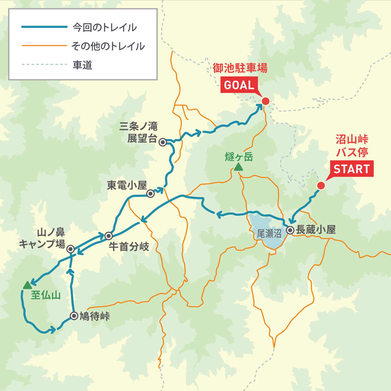 【2日目】6:00山の鼻キャンプ場出発、8:30至仏山(2.7km)、10:10鳩待峠(7.4km)、11:40牛首分岐(12.5km)、12:40東電小屋(15.7km)、14:00三条の滝展望台(19.3km)、16:40御池駐車場/解散(25.6km)