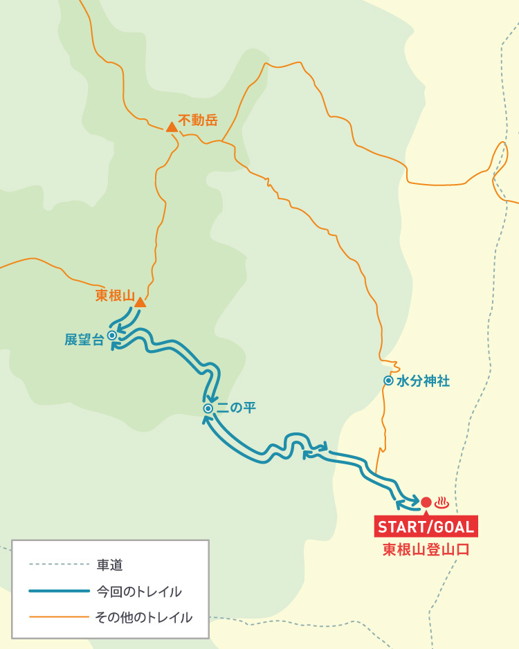 9:00東根山登山口/集合、9:10レンタル製品への交換と簡単なブリーフィング、9:40ハイキング開始、12:00東根山山頂、12:10山頂付近で昼食、13:00下山開始、15:00東根山登山口/解散