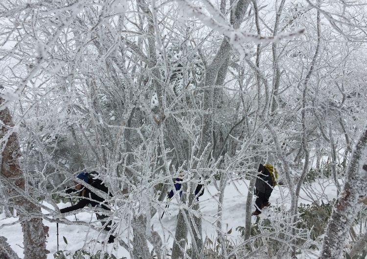 松山市街から車で1時間ほどでアクセスできる皿ヶ嶺連峰は、登山レベルに合わせて複数のルートを選択することができ、家族連れから上級ハイカーまで、四季を通じて素晴らしい自然を堪能できる人気の高い山域です。北面の大きなブナ林や苔むしたエリアは特に美しく、また冬季には十分な積雪もあり、気軽に雪山登山を楽しむことができることも魅力のひとつです。
