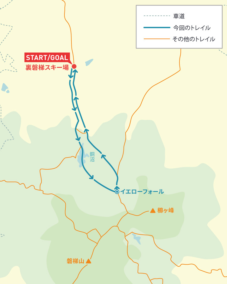 9:00裏磐梯スキー場(集合)、9:10レンタル製品への交換と簡単なレクチャー、9:45ハイキング開始、12:00イエローフォール周辺で昼食、13:00下山開始、15:00裏磐梯スキー場(解散)