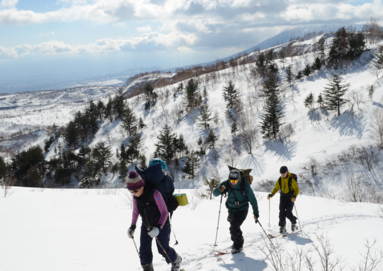 - バックカントリーでハイクアップとスキー滑走