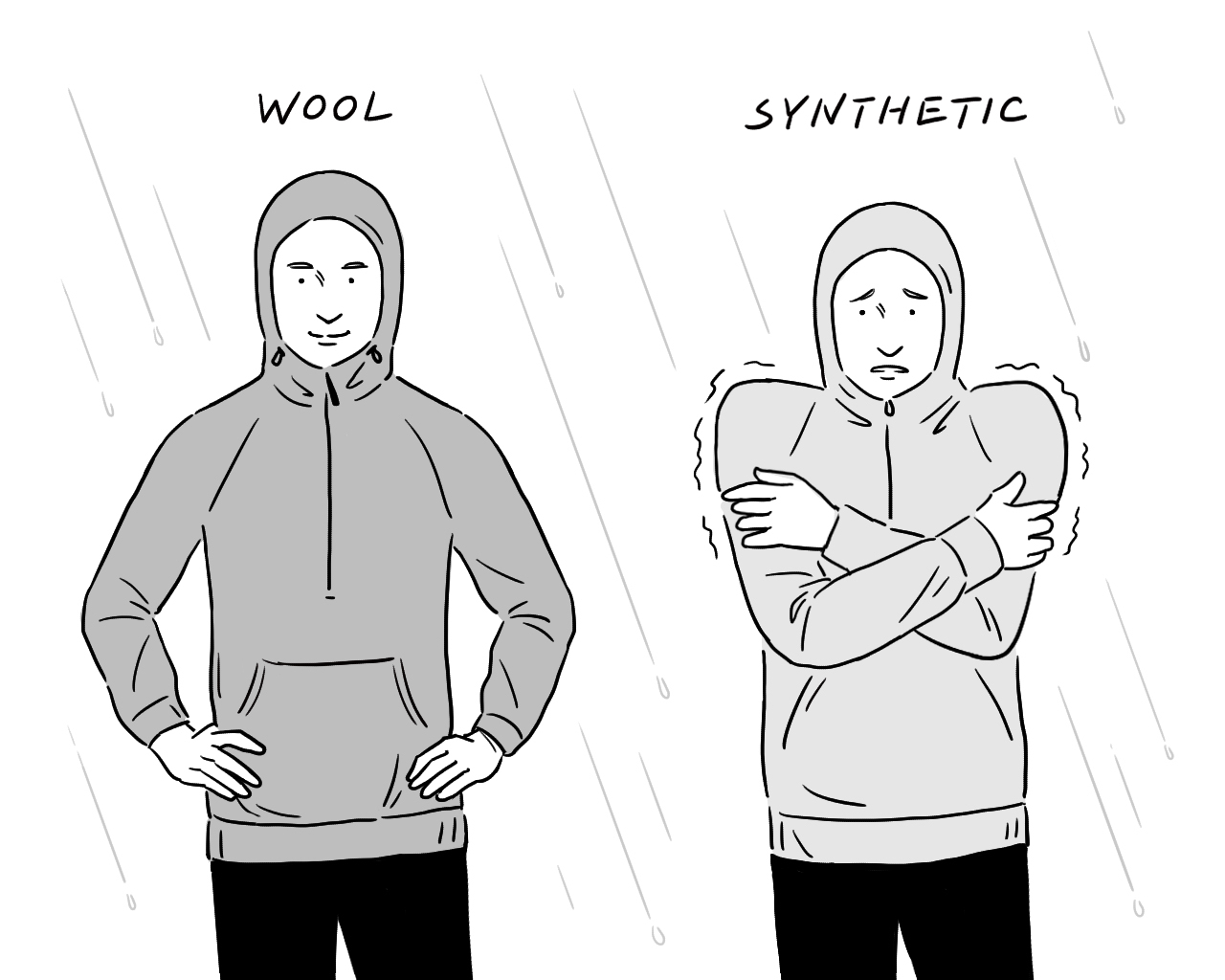 ウールは濡れると「吸着熱」を発する。熱伝導率が低いため体温が奪われにくく、濡れても糸に弾力性があり、潰れずに繊維間の空気を保持することで保温性は劣らない。さらに繊維内部に吸水する性質があり、肌面から水分を吸い上げドライな着心地を維持してくれる。