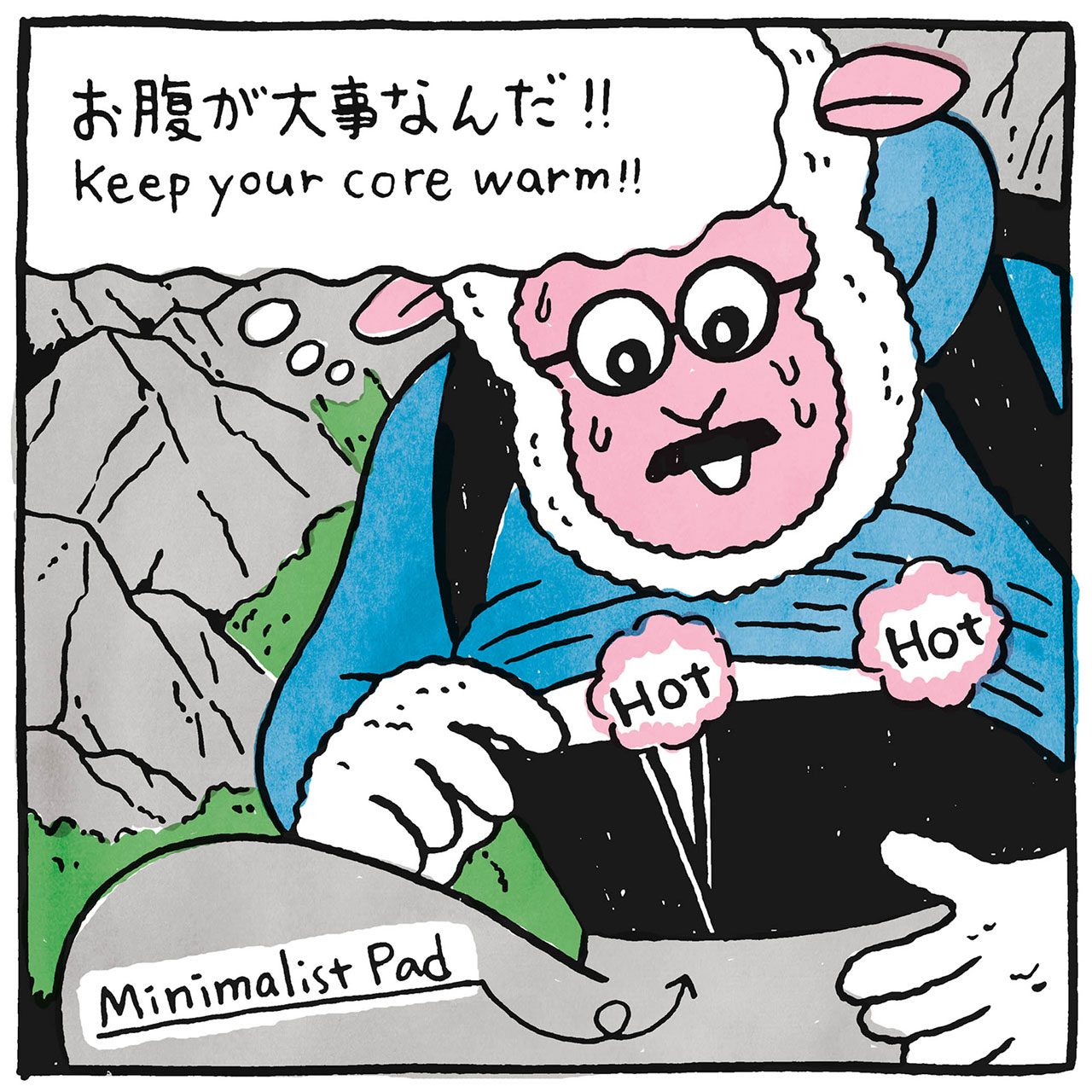 そのとき、これを腹に巻いてみてはどうかと閃いた。山で寒いとき、僕はMinimalist Padをシュラフの中に巻いて寝ることがあるのだ。Minimalist Padを腰から腹に巻き、レインジャケットを着てみるとお腹が暖まってくるのを感じて、まだガチガチと震えてはいたけれど、どうにか歩き続けることができた。陽が昇り、ようやく危険な状況を抜けたと感じたとき、太陽の偉大さにどれだけの感謝をしたことか。