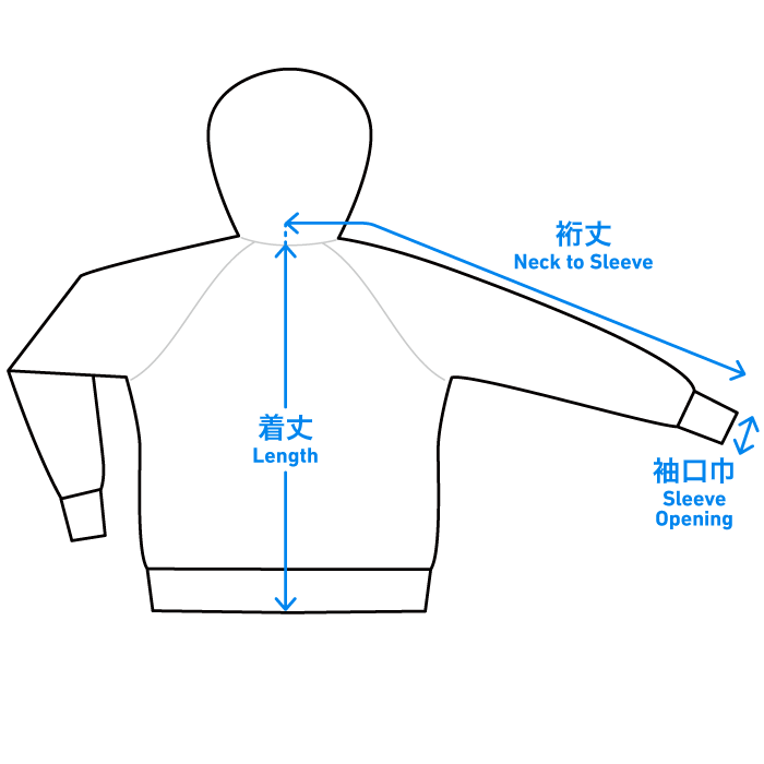 袖は肩や腕を動かしやすいラグランスリーブ仕様です。フードはフィット感の高い3枚はぎのパターンを採用しています。