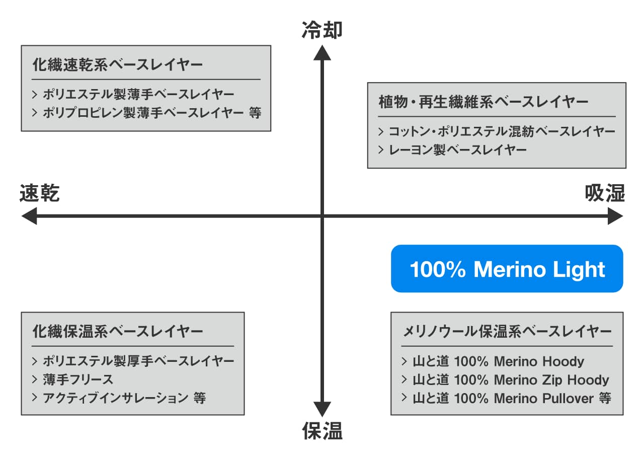 速乾性は化学繊維のベースレイヤーに劣りますが、そのぶん汗の蒸発の気化熱による冷えが少なく、雨等の濡れによる体温低下のリスクが低い素材で、速乾性よりも吸湿性、冷却性よりも保温性を重視した性格を持ちます。