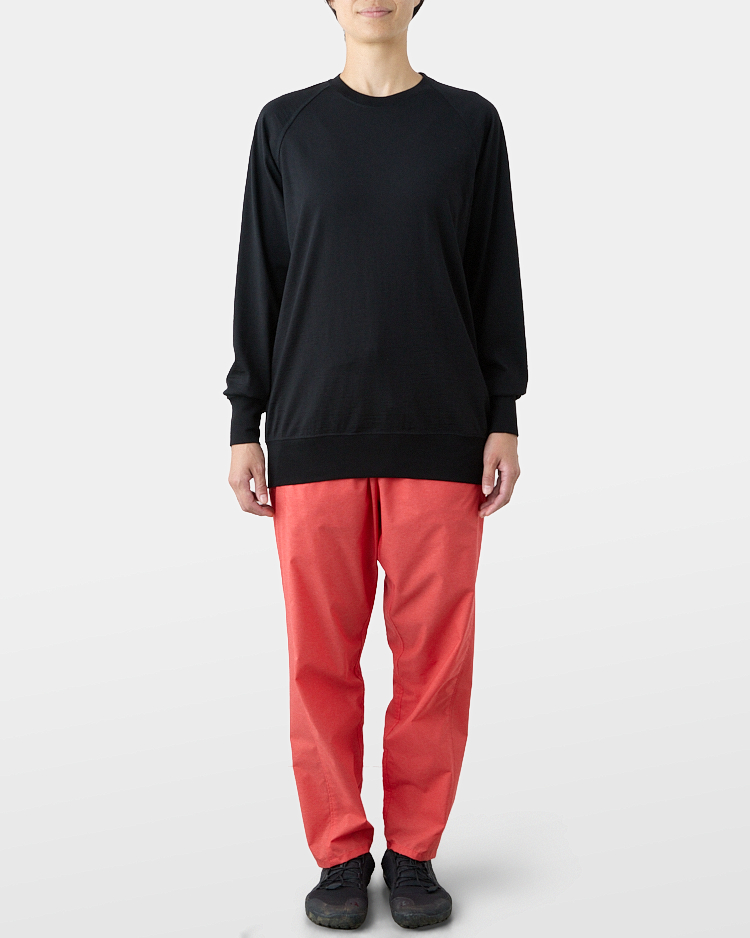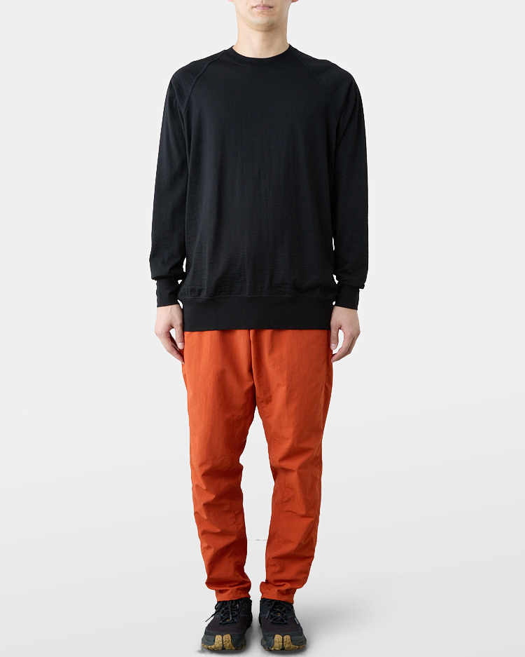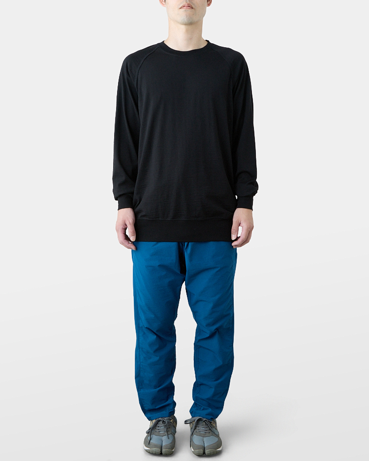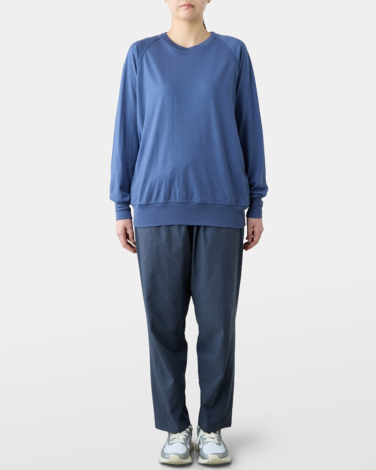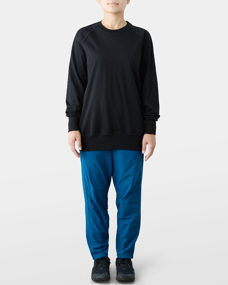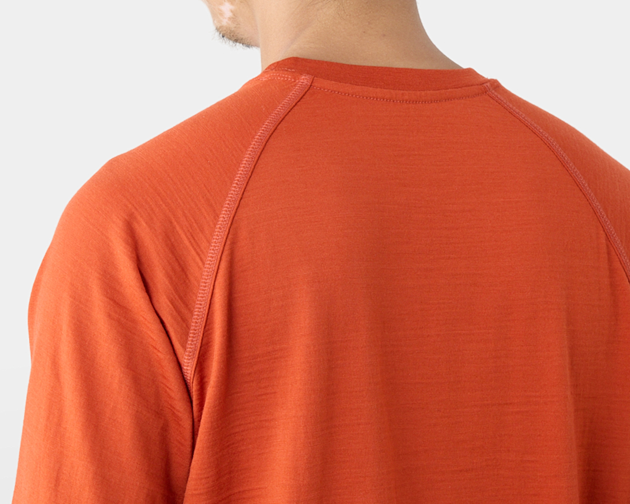 袖は肩の可動域が広く、腕を動かしやすいラグランスリーブ仕様。3本針のカバーステッチが特徴的なフラットですっきりとした仕上がり。襟ぐりは伸縮性の高いリブ生地で仕立てた。