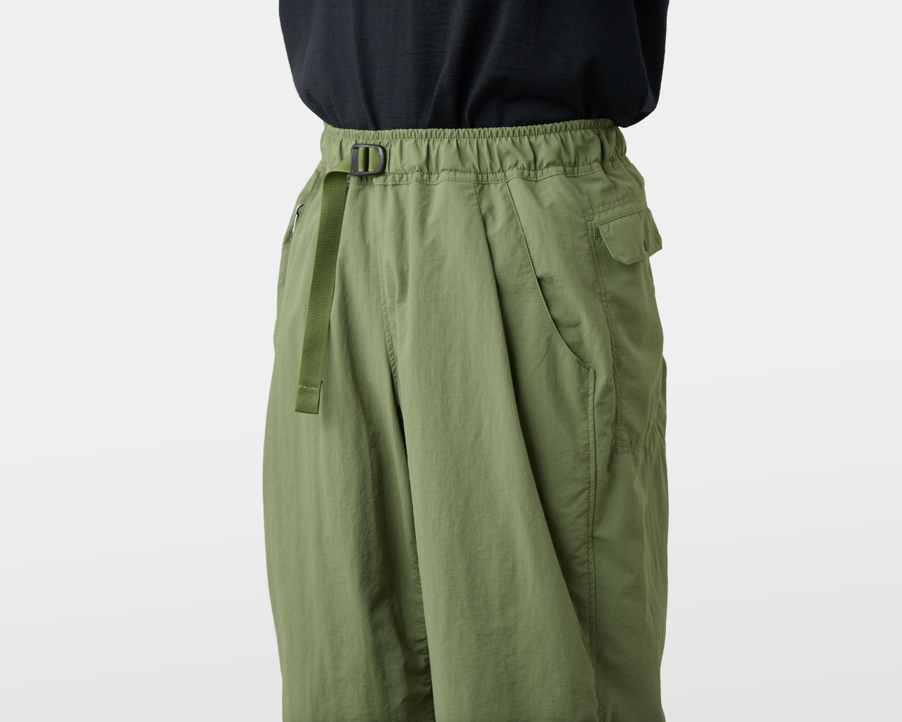 日本の伝統的な作業着であるモンぺとバルーンシルエットというふたつの異なるアプローチを元に、フィールドテストを繰り返しながら2年をかけて細部を検証。結果、ふたつのアプローチが融合し、一般的なワイドパンツとは違う、山でも抜群に動きやすい独自のパターンとシルエットが完成した。