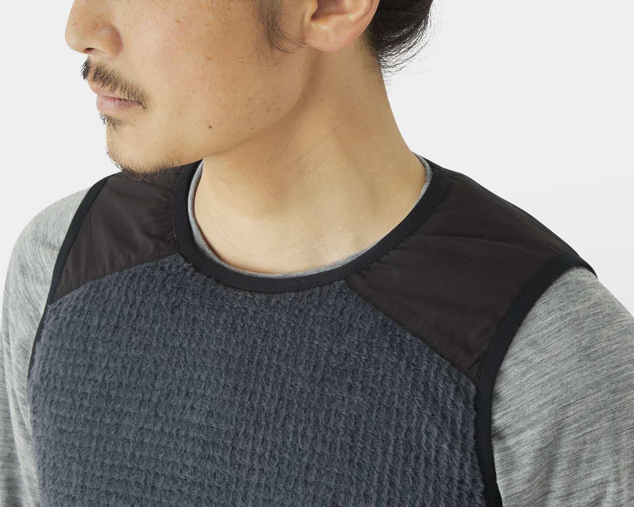 特徴 前身頃に保温性の高い厚手のポーラテック・アルファダイレクト(136g/m²)を配置したベスト。寒冷時の行動着や保温着の補助として活躍する。温暖な季節であれば、これ1着で保温着を完結させることも検討できる。