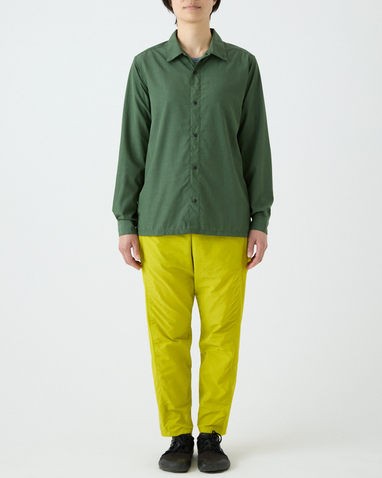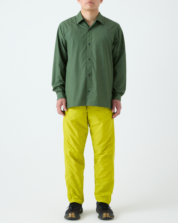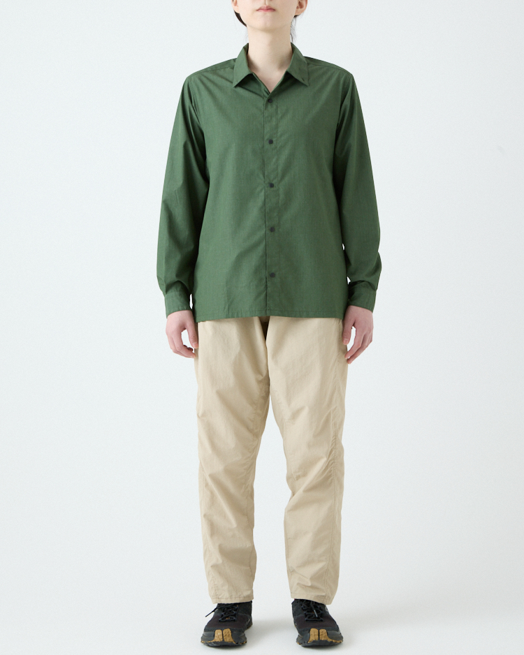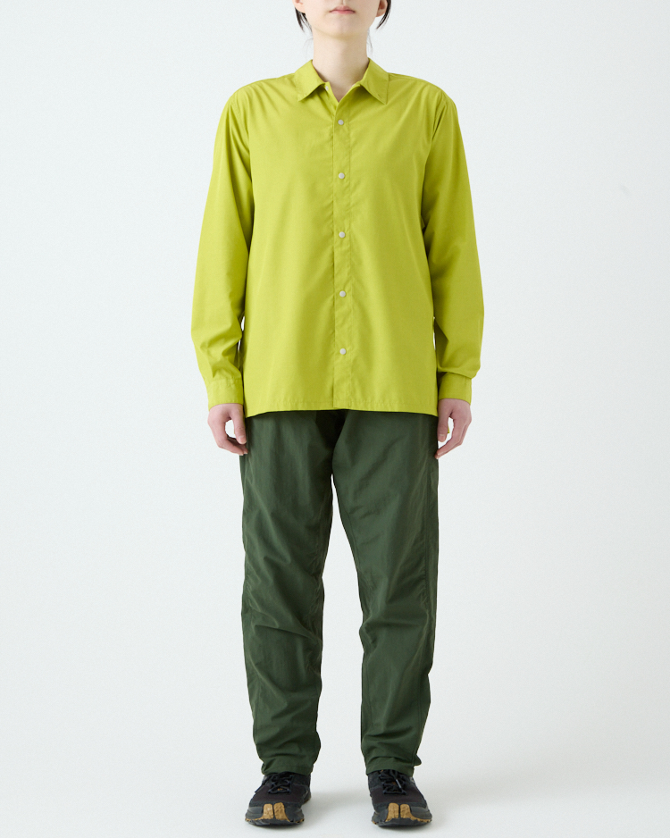 その上で山と道はシャツの機能性の本質を、織物ならではの防風性の高さと、ボタンで前開きできることで換気性が良く、衣服内に外気が循環しやすいことと捉え、山で使えるシャツ=トレイルシャツをデザインした。