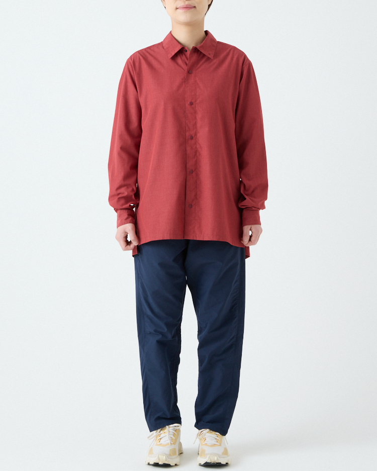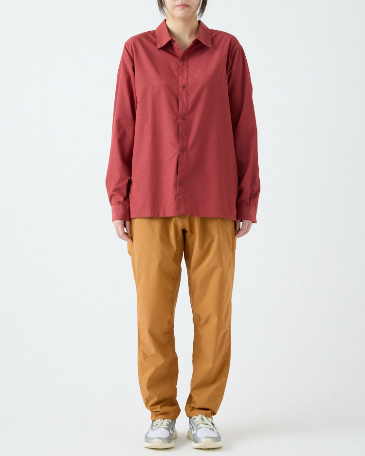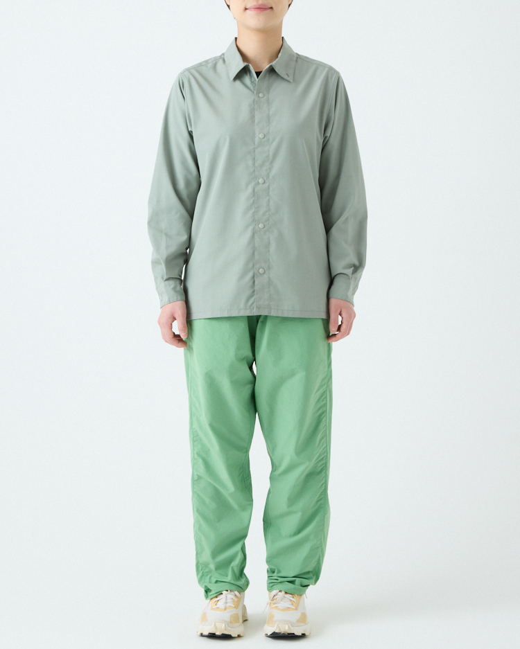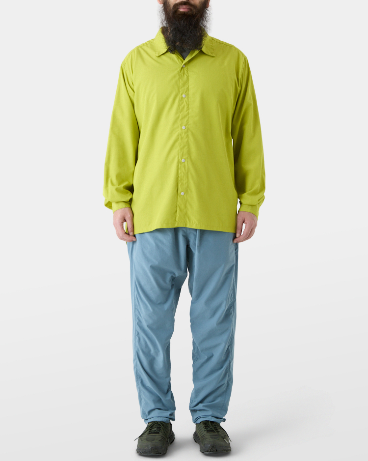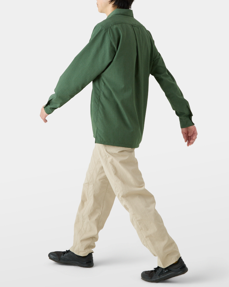その上で山と道はシャツの機能性の本質を、織物ならではの防風性の高さと、ボタンで前開きできることで換気性が良く、衣服内に外気が循環しやすいことと捉え、山で使えるシャツ=トレイルシャツをデザインした。