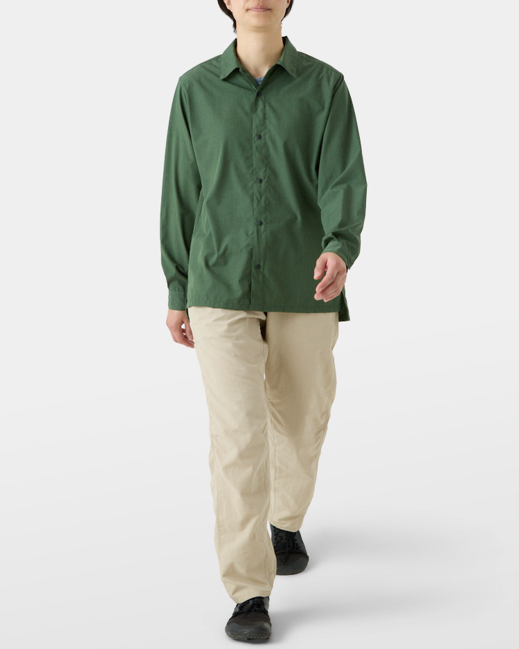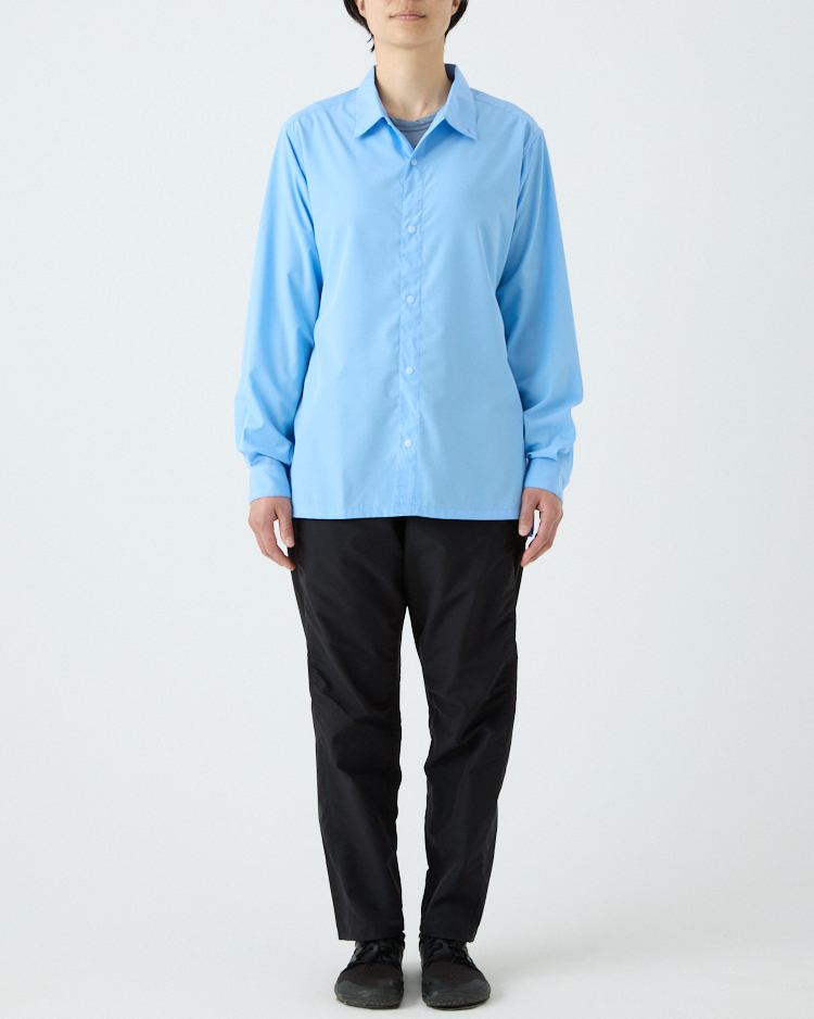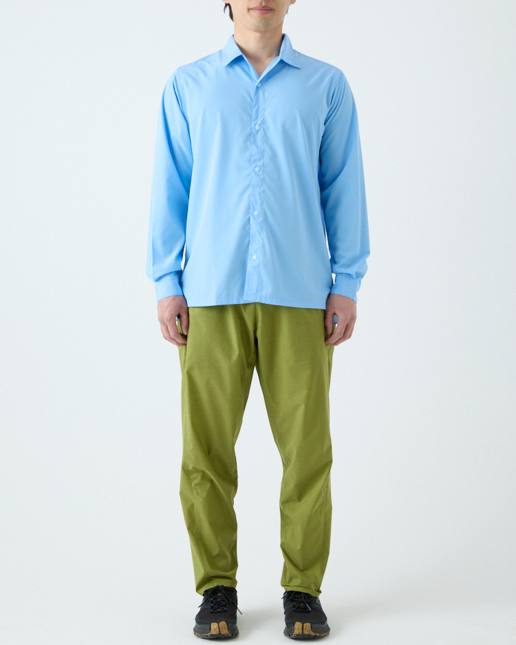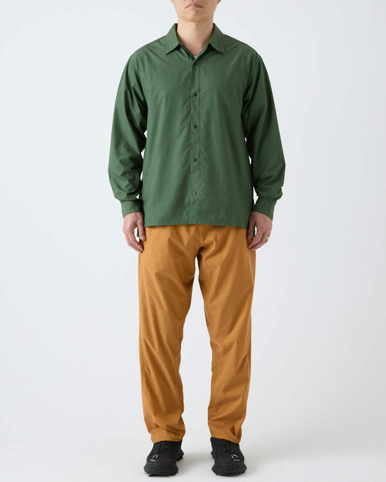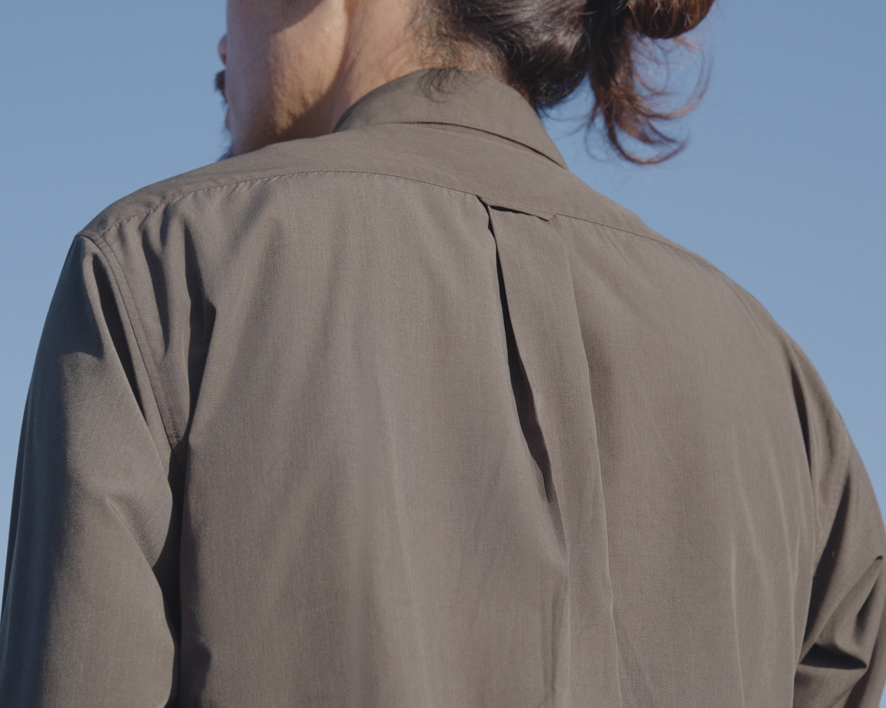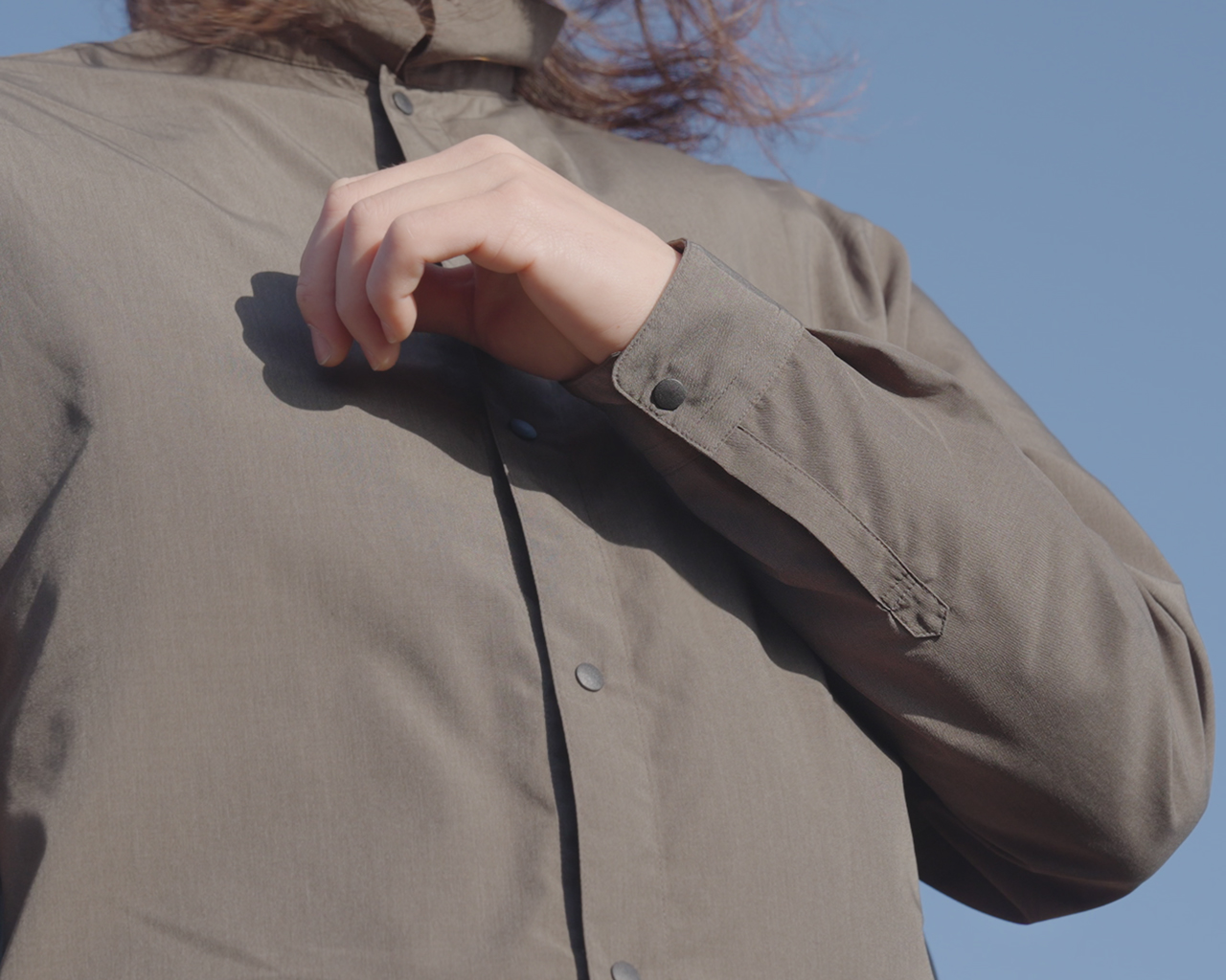 ワイドフィットと首元に熱のこもりにくいオープンカラーで暑い時もヒートアップしすぎず、スナップボタンで前を一気にあけたり、素早く袖をまくりあげたり、寒いときは襟を立ててボタンでとめられたり、防風性と体感温度を自在にコントロールできる。