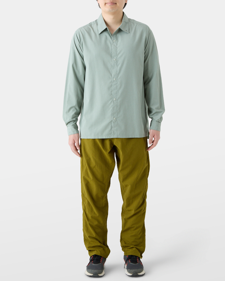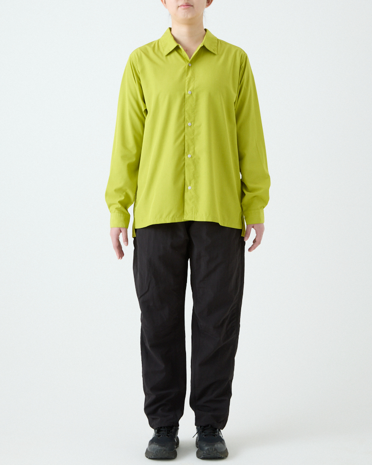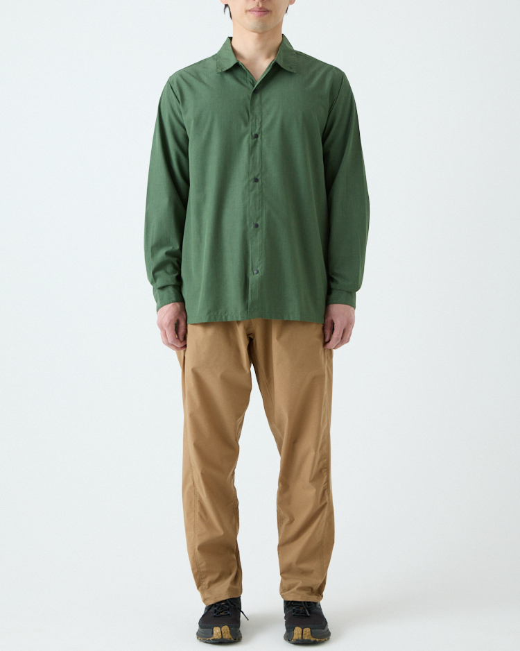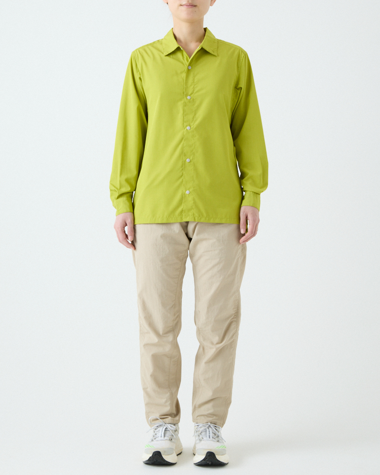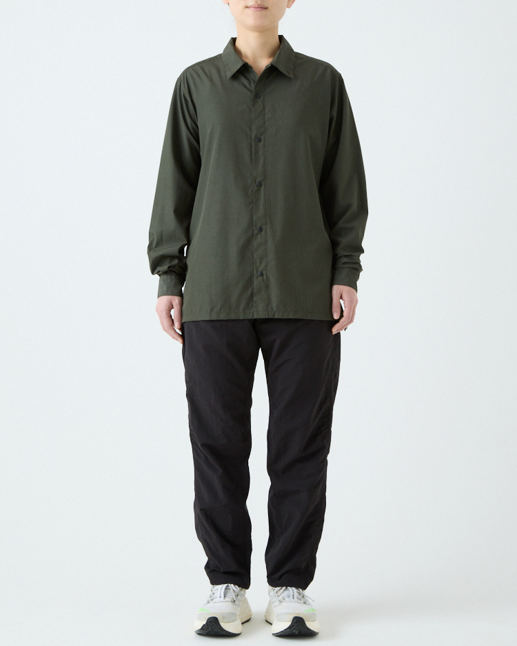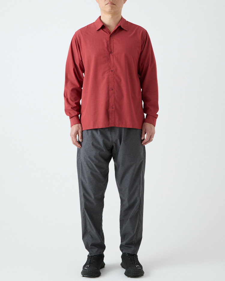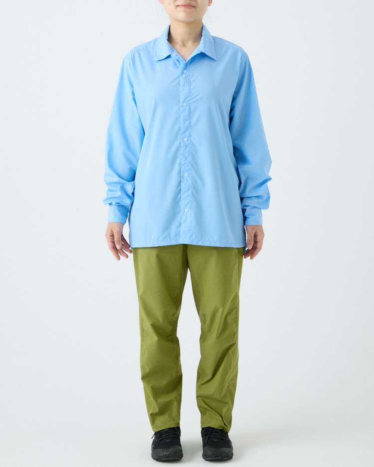 ワイドフィットと首元に熱のこもりにくいオープンカラーで暑い時もヒートアップしすぎず、スナップボタンで前を一気にあけたり、素早く袖をまくりあげたり、寒いときは襟を立ててボタンでとめられたり、防風性と体感温度を自在にコントロールできる。