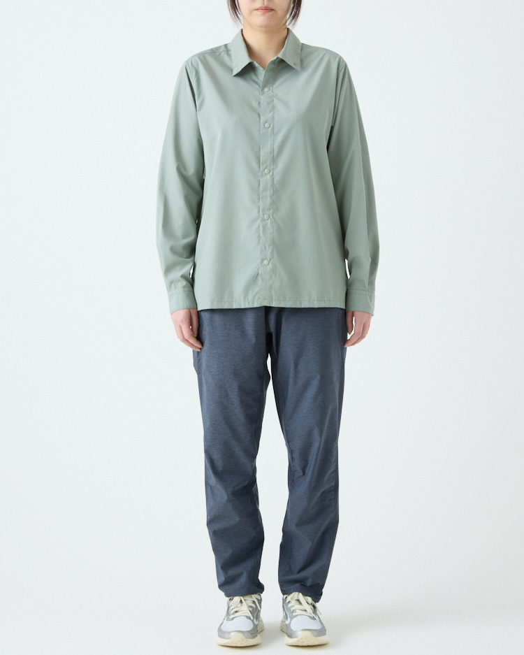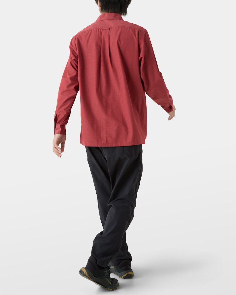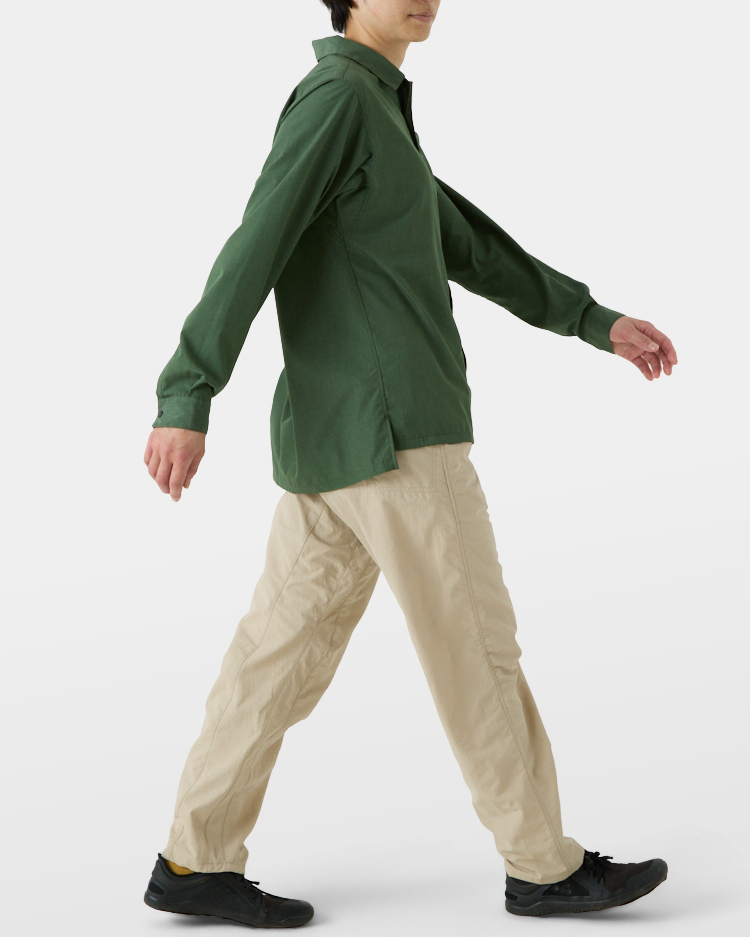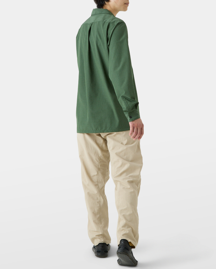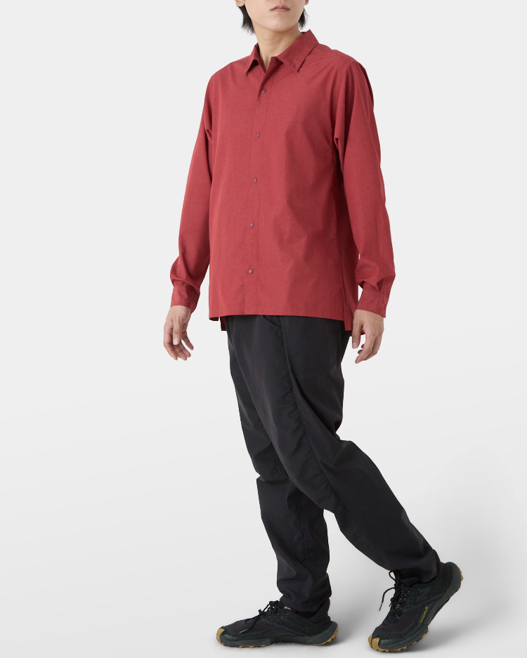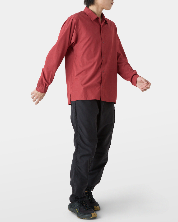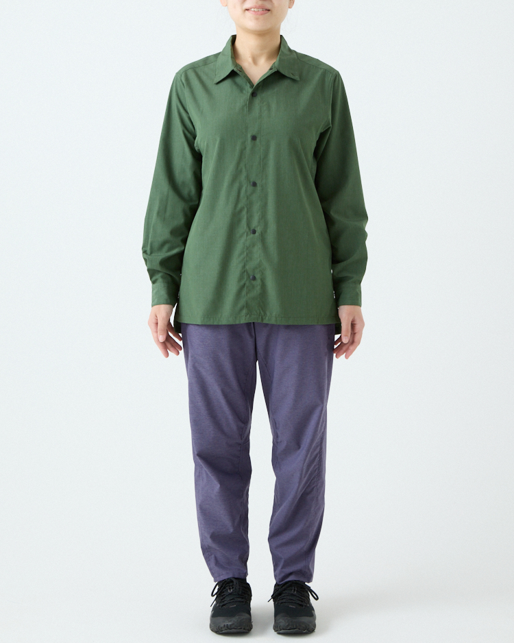 ワイドフィットと首元に熱のこもりにくいオープンカラーで暑い時もヒートアップしすぎず、スナップボタンで前を一気にあけたり、素早く袖をまくりあげたり、寒いときは襟を立ててボタンでとめられたり、防風性と体感温度を自在にコントロールできる。