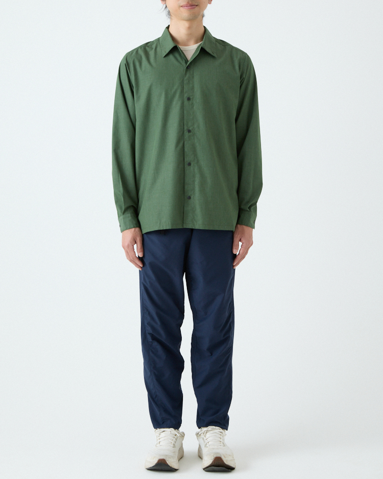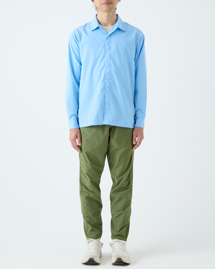 ウールと似た吸湿性と消臭性を持つバンブー(竹)とポリエステルを混紡した生地はしっとりとした肌触りを持ち、シャツならではの防風性と天然の調湿機能がいつでも快適な着心地を維持。