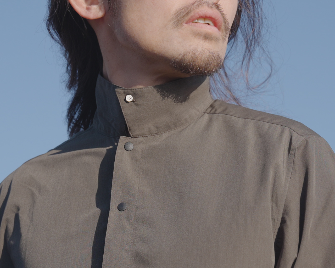 早朝や夕暮の肌寒い時間帯や強風下など、山では首元を保温したいと思う場面は多い。そこで山と道オリジナルのギミックとして、襟を立ててボタンで留められるようにした。非常にシンプルなデザインだが保温や防風の他、首の日焼け対策にも有効だ。