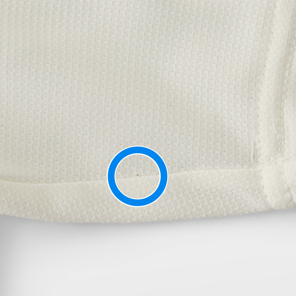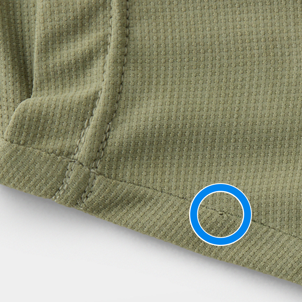 超軽量かつ極薄のメッシュ生地の特性上、縫製時の針跡が残りやすく、襟ぐりや裾、袖口などの縫製箇所の近くに、小さな針跡の穴が目視できる製品が一定数発生しました。機能性や着用上の問題はなく、通常使用には支障がないものの、外観に小さな針跡の穴が見える製品を20%OFFのスペシャルオファーとしました。