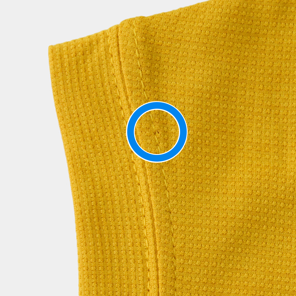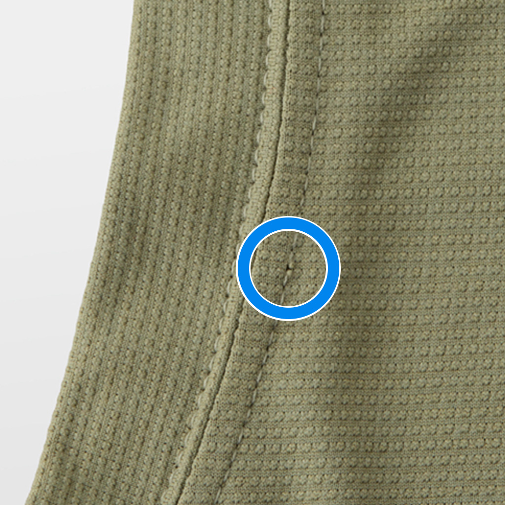 超軽量かつ極薄のメッシュ生地の特性上、縫製時の針跡が残りやすく、襟ぐりや裾、袖口などの縫製箇所の近くに、小さな針跡の穴が目視できる製品が一定数発生しました。機能性や着用上の問題はなく、通常使用には支障がないものの、外観に小さな針跡の穴が見える製品を20%OFFのスペシャルオファーとしました。