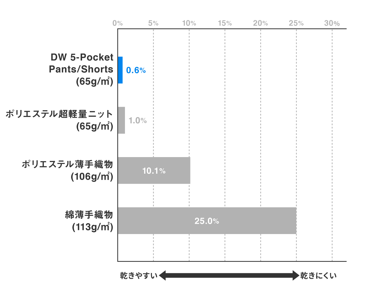下図はDW 5-Pocket Pantsと化学繊維のベースレイヤーや薄手の一般的な綿のシャツ等と脱水15分後の生地内の水分率を比較したものです。水分率は低いほど速乾性が高いと言え、DW 5-Pocket Pantsの脱水15分後の水分率0.6%はほぼ乾いていることを示します。