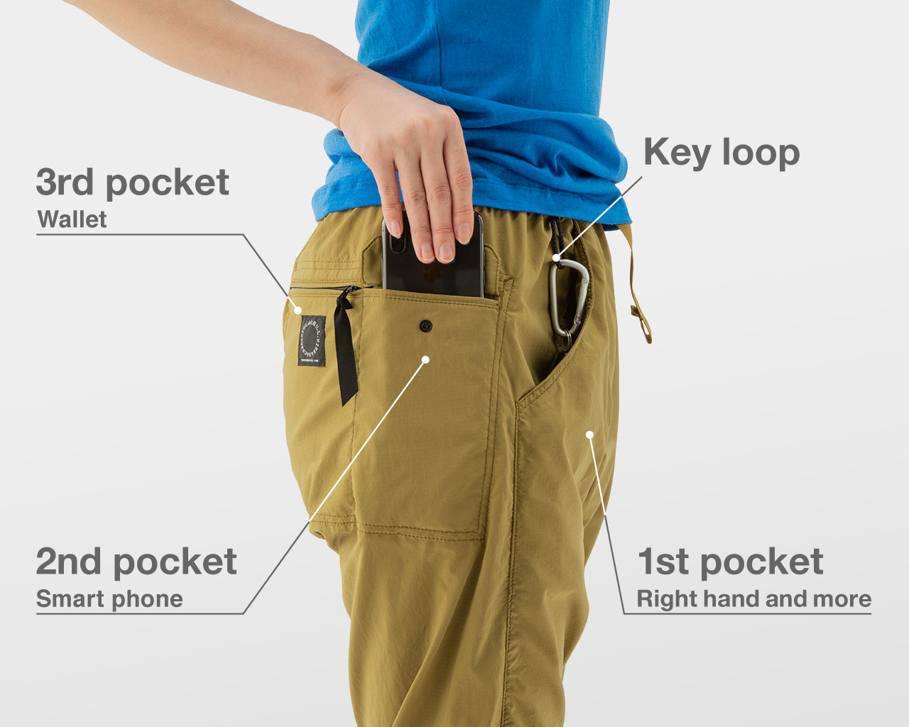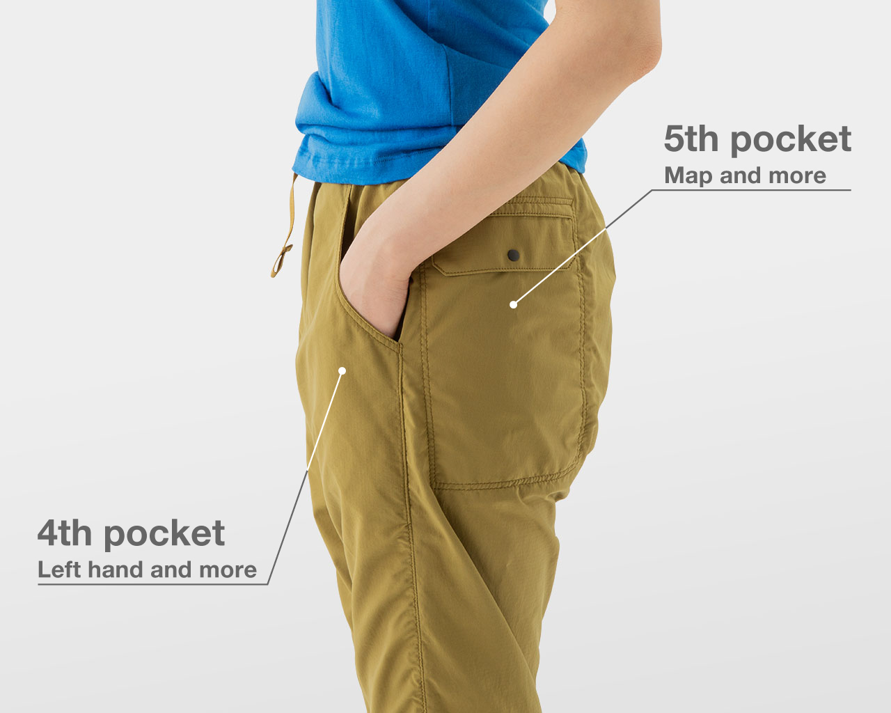 山と道オリジナルデザインの5つのポケットが、ハイキング中に必要な荷物を足の動きを邪魔することなく効率的に収納します。