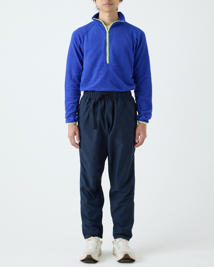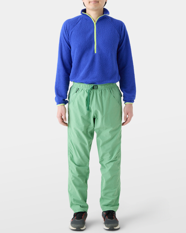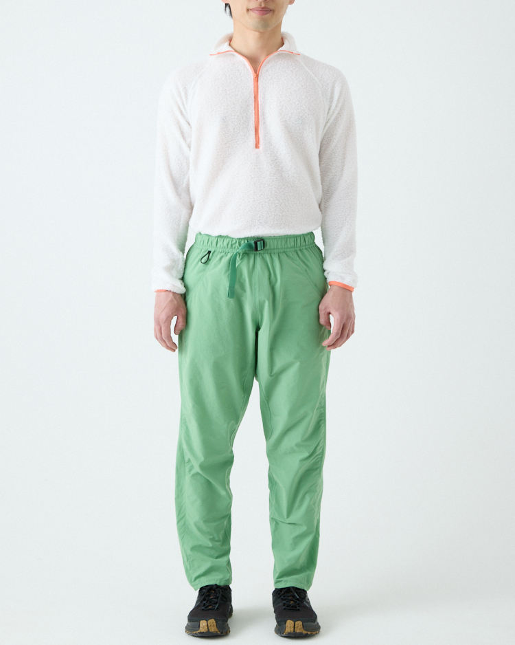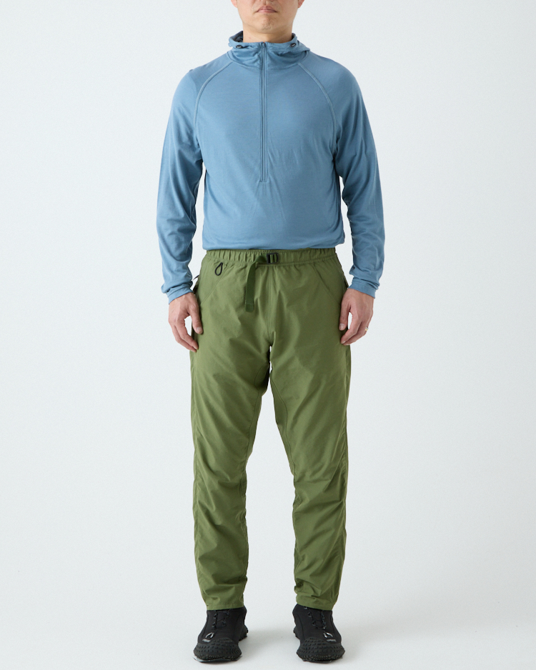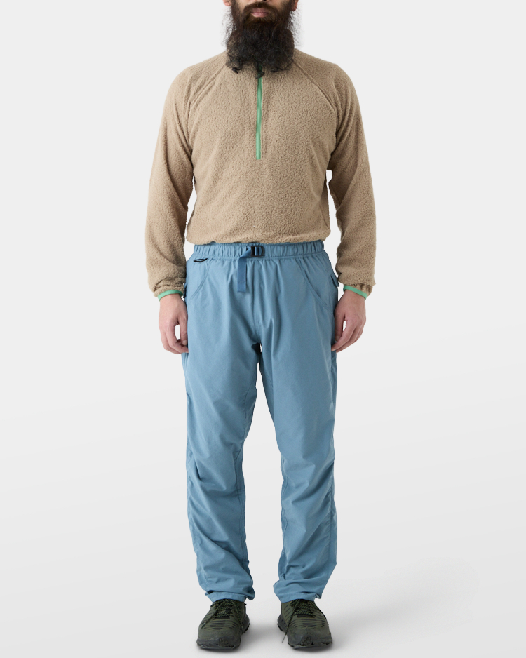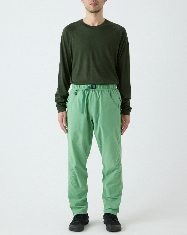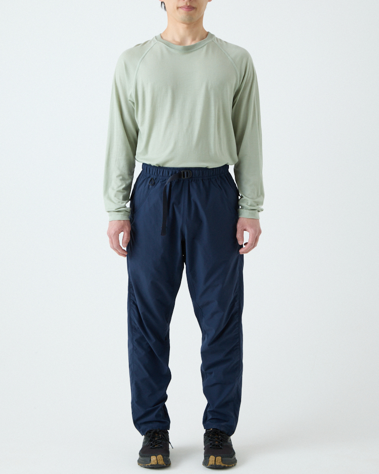 濡れても動きやすさを維持する肌離れの良さに加え、脚の上げ下げを邪魔しないよう、太ももから膝にかけての「いせ縫い」を5-Pocket Pantsより多めに入れ、さらに生地の1方向へのストレッチ性を前面は縦方向に、背面は開脚時の動きを考え横方向に使い分けることで、山と道のパンツの中でも特に動きやすい1本に仕上がった。
