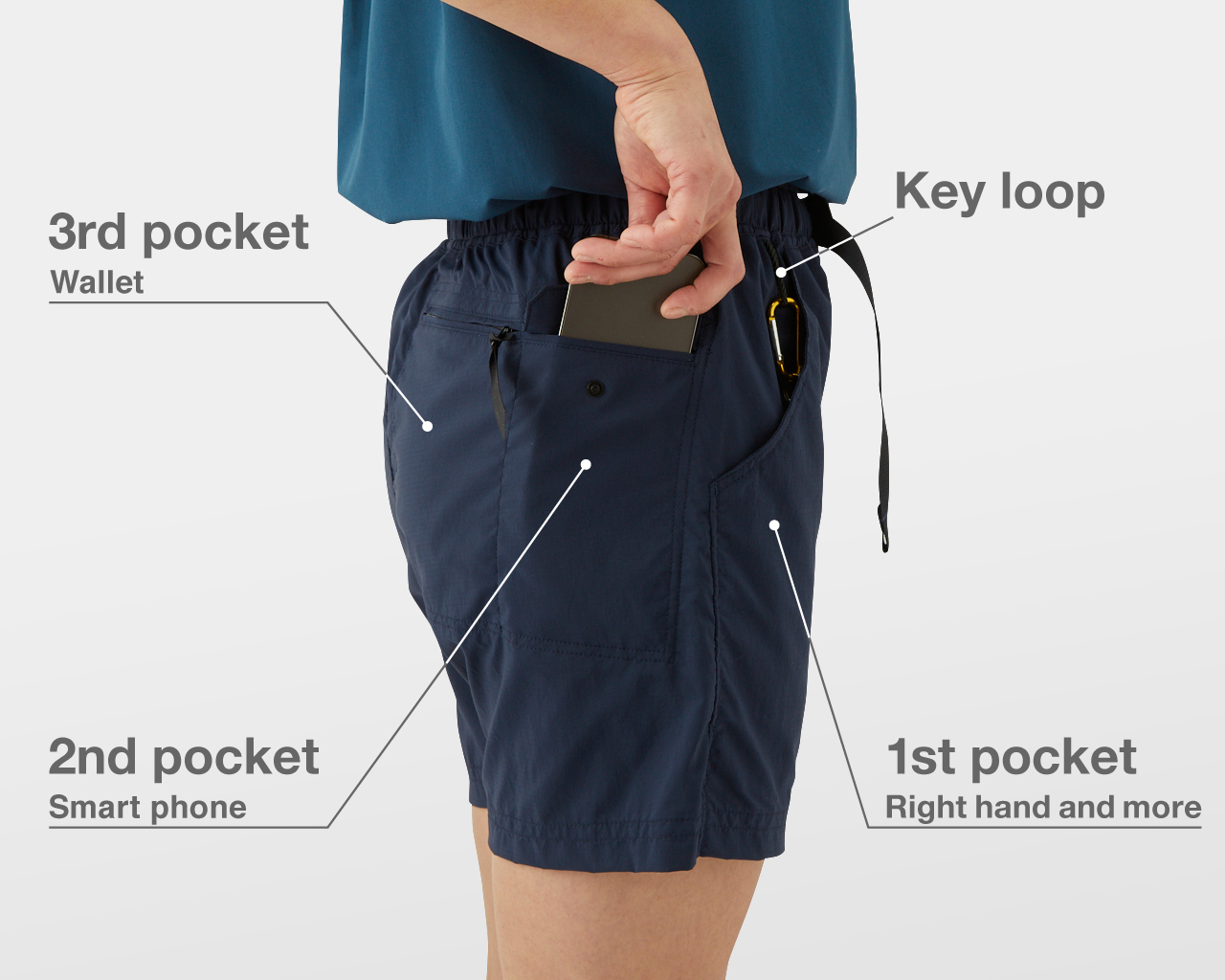 山と道オリジナルデザインの5つのポケットが、ハイキング中に必要な荷物を足の動きを邪魔することなく効率的に収納します。