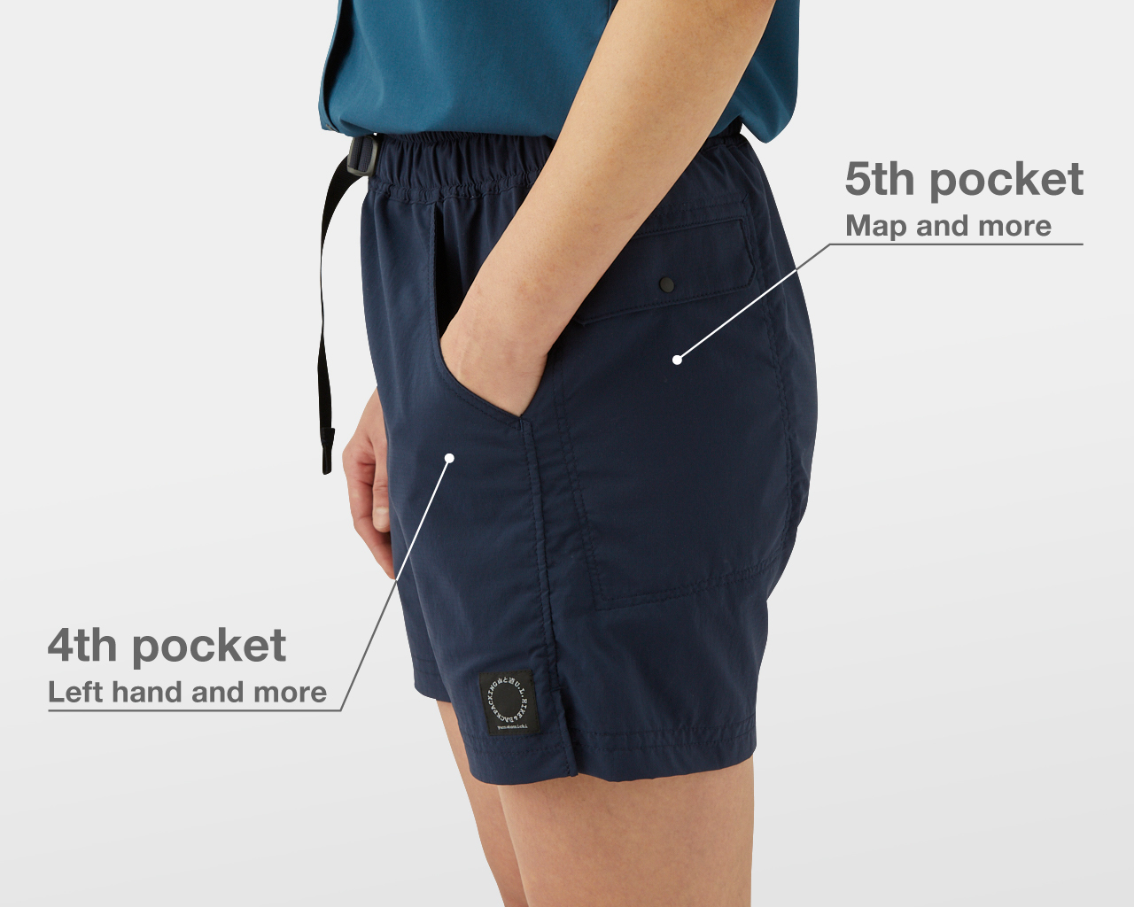 裏面が凹凸のある二重織り構造になっている特注のパーテックス・イクイリブリアム素材は肌離れが良く、汗をかいても快適。もちろん、足上げを邪魔しない位置に配置した山と道独自の5つのポケットで、スマートフォンや地図をすっきりと収納できる。