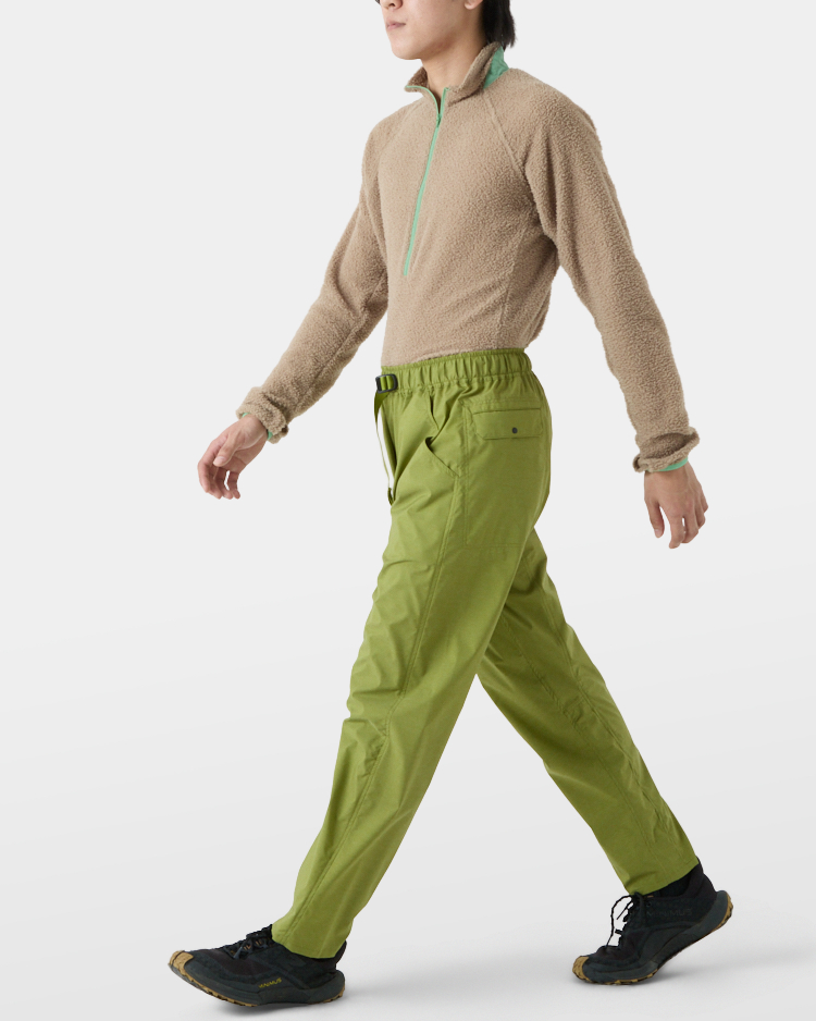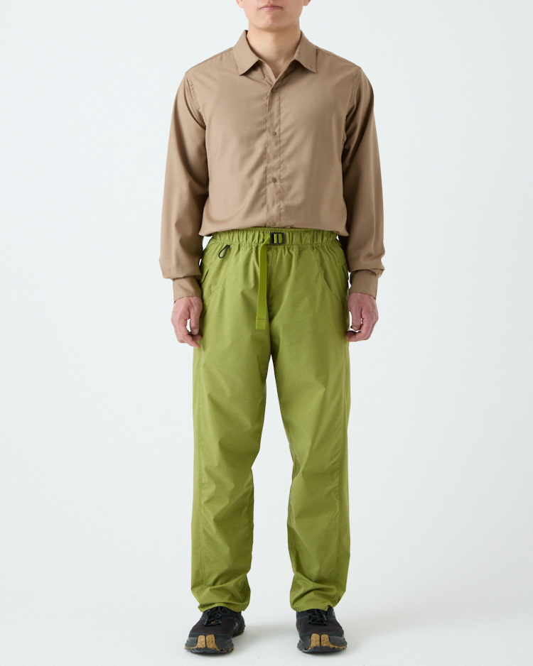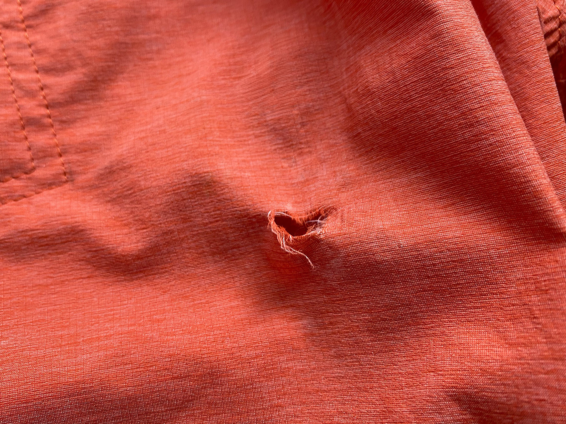 Light 5-Pocket Pantsに使用しているパーテックス・イクイリブリウムは非常に薄く軽量な素材のため、リップストップ構造で強度を持たせてはありますが、岩や枝など鋭利なものに擦れると小さな穴が開き、そこから生地が裂けることがあります。岩稜地帯を通過する際や休憩時に岩場に腰を降ろす際などはご注意ください。