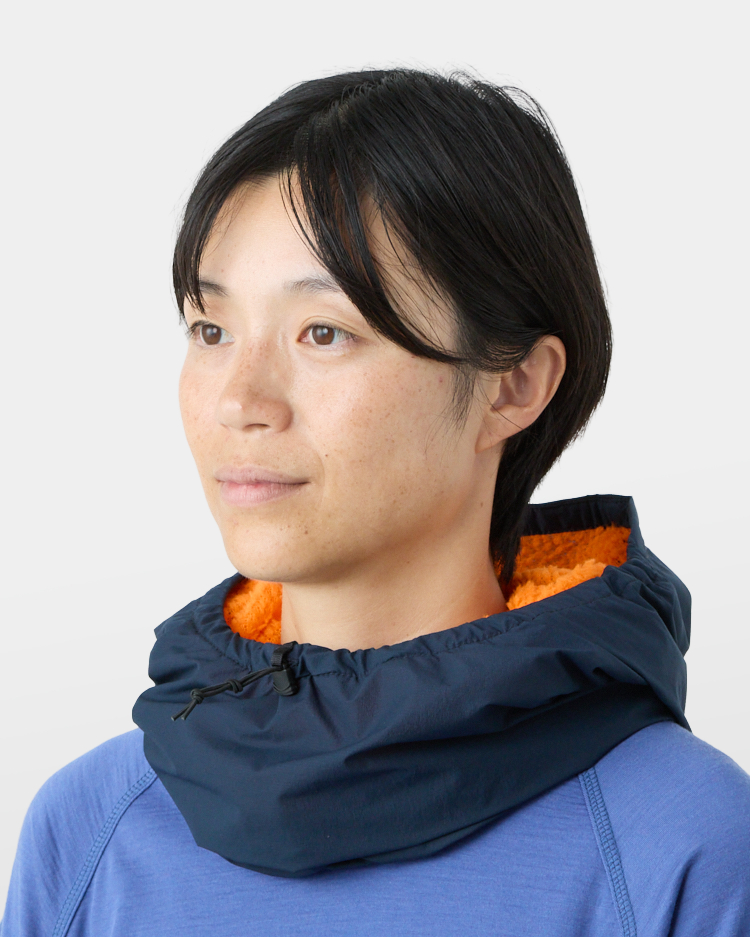 あご下のストレッチコードを首元で絞れることで、ネックウォーマーとしても使用できる。