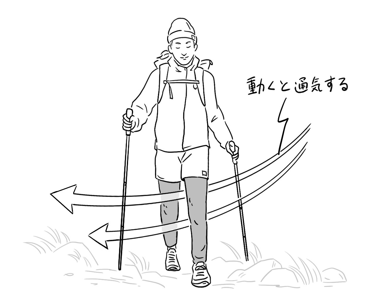 天然ダウンや化繊ダウンは蒸気を封じ込めて保温する一方、蒸れやすいという特性を持っている。