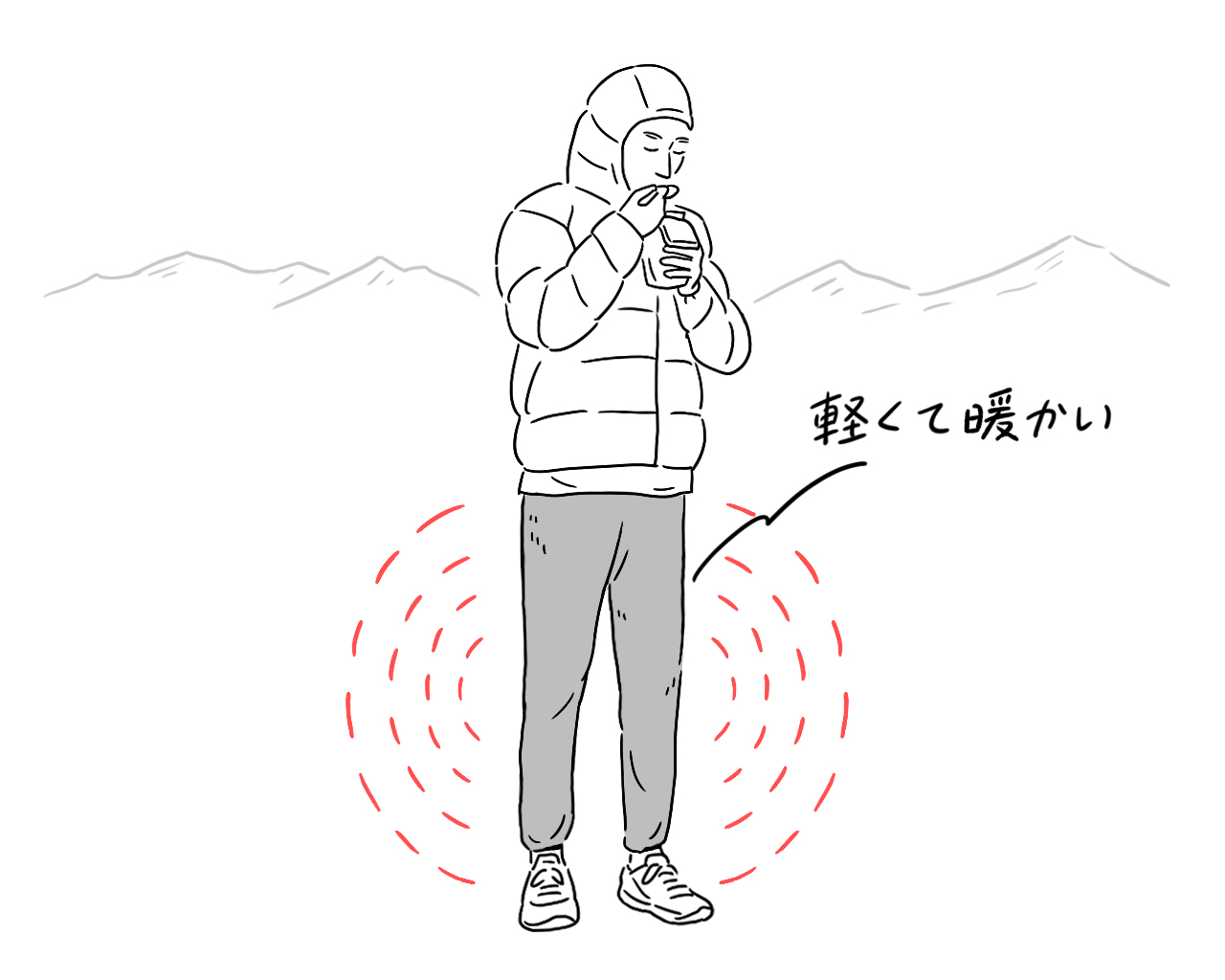 保温力はダウンパンツに劣るものの、わずか96g(Size S)と軽量なので、より気軽に携行できます。