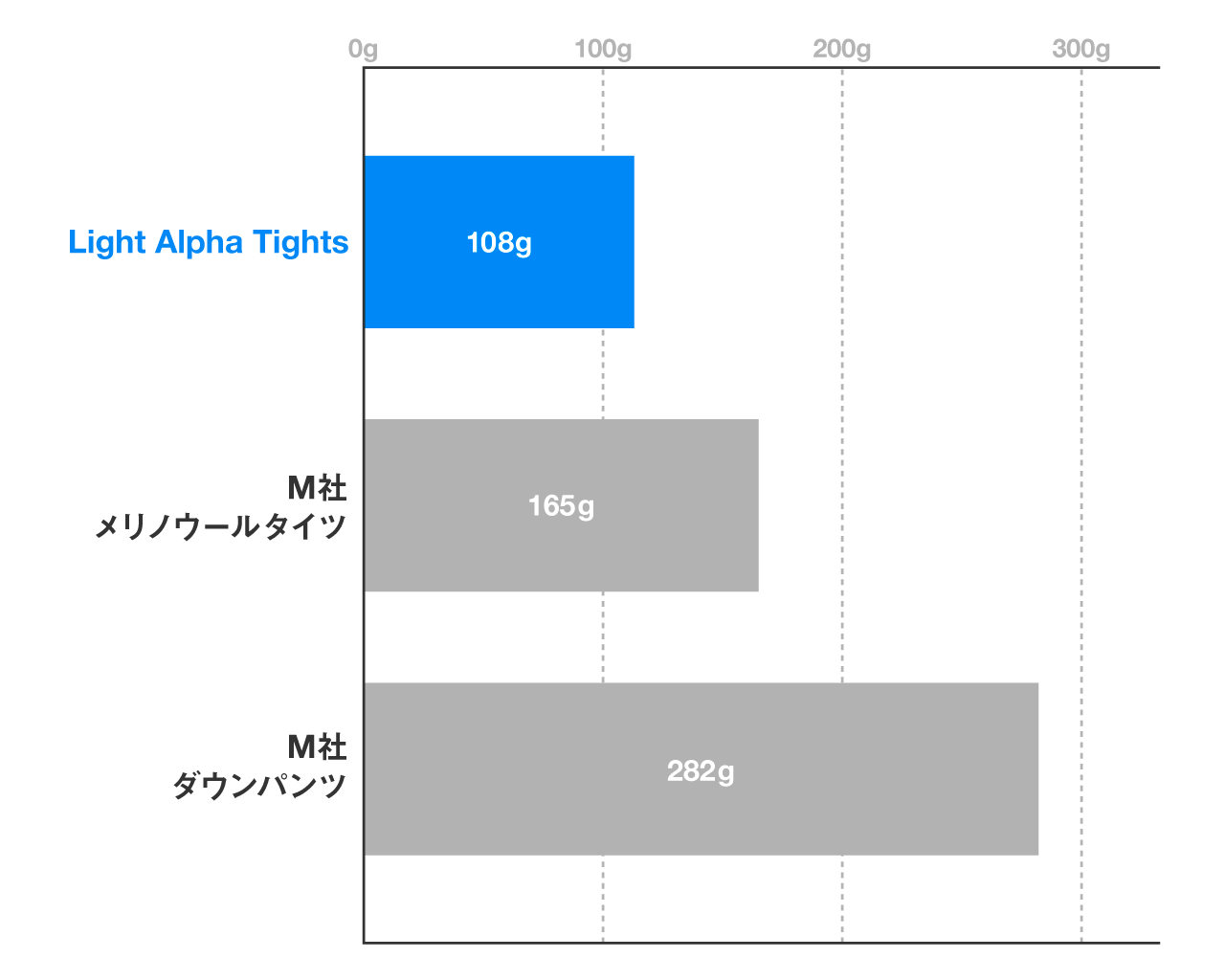 一般的な軽量ウールタイツやダウンパンツよりも軽量で、ボトムのインサレーションを持っていくか迷うシチュエーションでも気軽に携行できます。