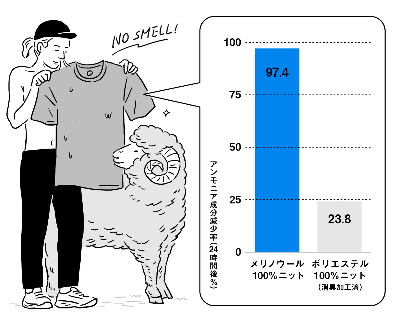 メリノウールには「1週間着続けても匂わない」と言われる天然の高い消臭機能があり、化学繊維にも消臭機能を施されたものがあるが、実際の性能はメリノウールが圧倒的に優れている。