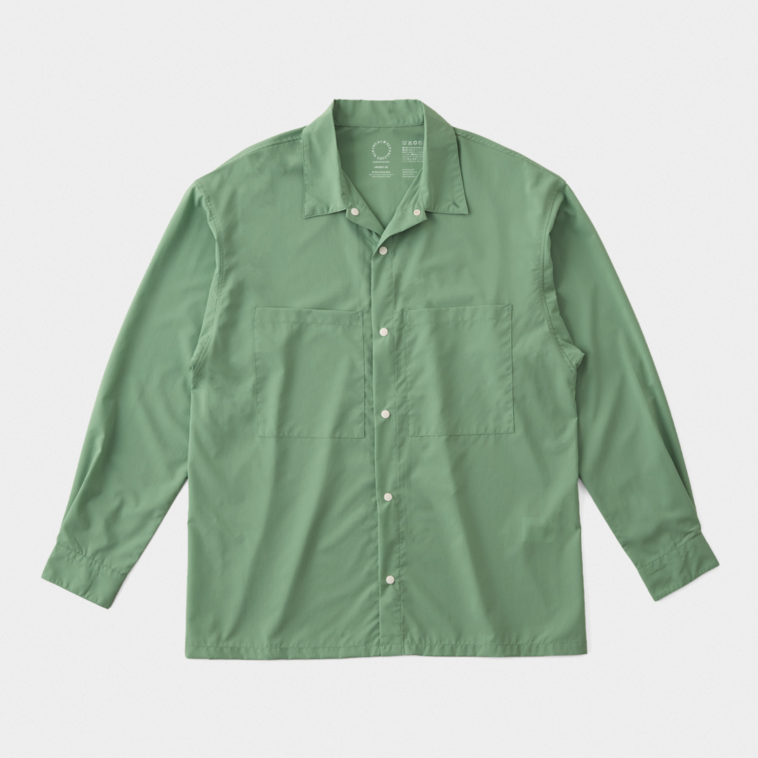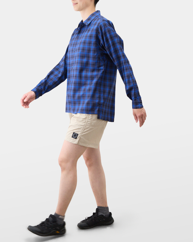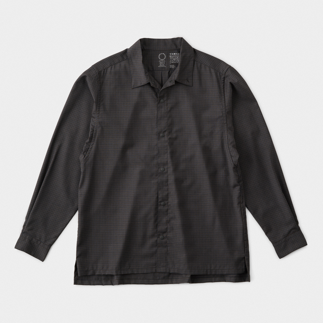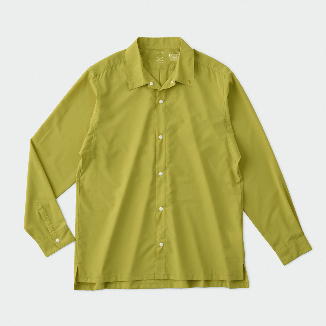 その上で山と道はシャツの機能性の本質を、織物ならではの防風性の高さと、ボタンで前開きできることで換気性が良く、衣服内に外気が循環しやすいことと捉え、山で使えるシャツ=トレイルシャツをデザインした。
