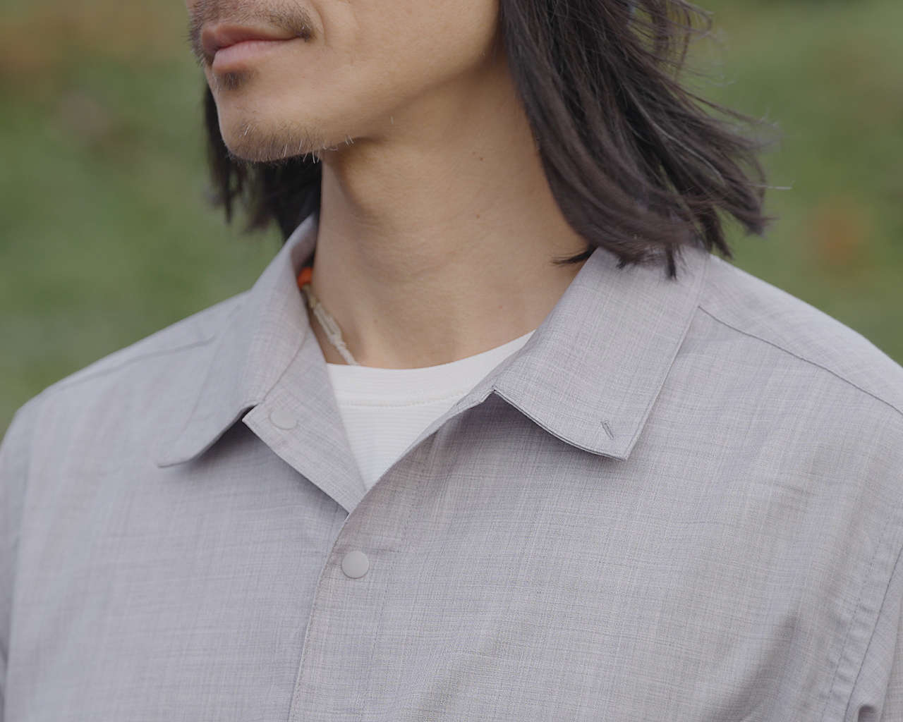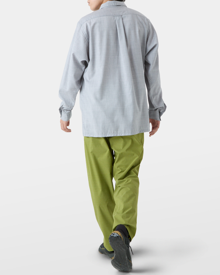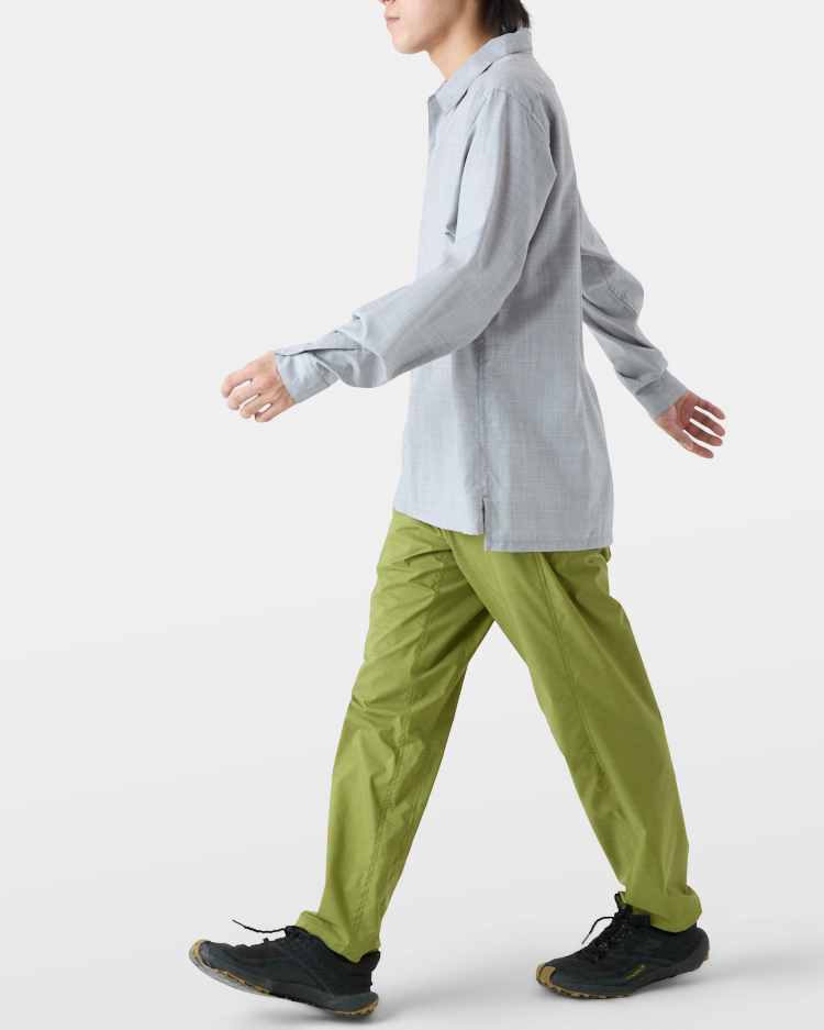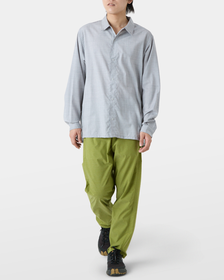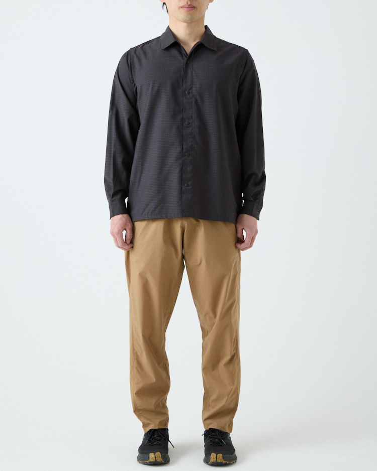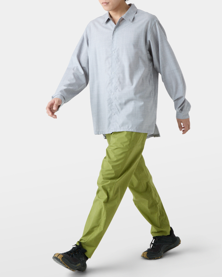 ワイドフィットとオープンカラーでヒートアップし過ぎず、換気したい時はスナップボタンで一気に前を開けたり、素早く袖をまくり上げたり、寒いときは襟を立ててボタンでとめたりと、山と道のトレイルシャツ独自のディティールで防風性と体感温度を自在にコントロールできる。