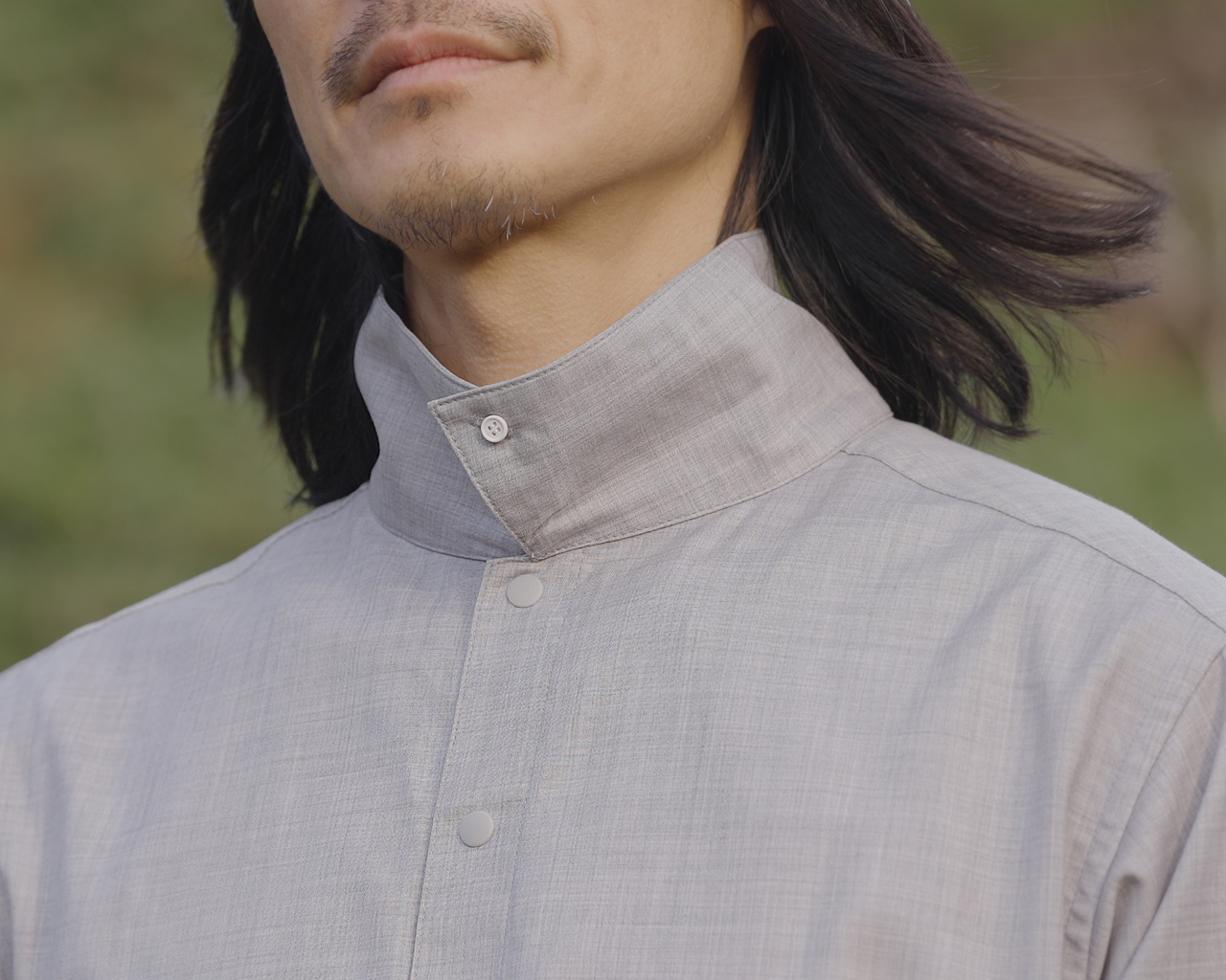 強風下や肌寒い早朝や夕暮など、山では首元を保温したいと思う場面は多い。そこで山と道オリジナルのギミックとして、襟を立ててボタンで留められるようにした。非常にシンプルなデザインだが保温や防風の他、首の日焼け対策にも有効だ。