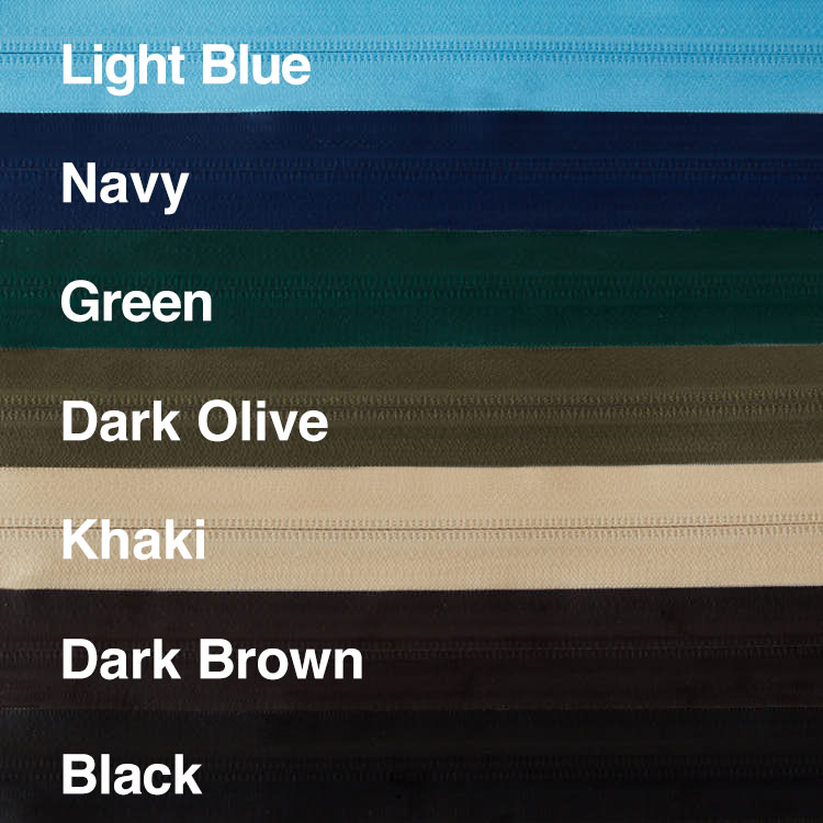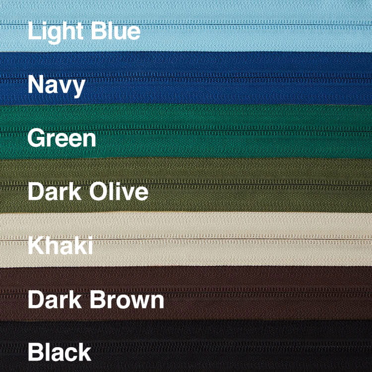 ジッパーはポケット生地に防水性が低いテクノフォース®スティールと、パーテックス21RS-PC、07RS-PCを選んだ場合は引きが軽く耐久性の高いコイルジッパー、防水性が高いX-Pacを選んだ場合は止水ジッパーと、生地の特性に適したものになります。カラーはそれぞれ14種類の中から選べます。